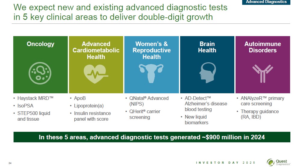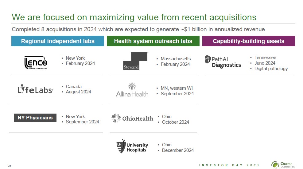 We expect new and existing advanced diagnostic tests in 5key clinical areas to deliver double-digit growth Advanced Diagnostics Oncology Advanced Cardiometabolic Health Women's and Reproductive Health Brain Health Autoimmune Disorders Haystack MRDTM IsoPSA STEP500 liquid and tissue ApoB Lipoprotein(a) Insulin resistance panel with score QNatalR Advanced (NIPS) QHeritR carrier screening AD-DetectTM Alzheimer's disease blood testing New liquid biomarkers ANAlyzeRTM primary care screening Therapy guidance (RA, IBD) Portfolio of new and existing advanced diagnostic tests generated ~900 million in 2024 24 Investor Day 2025 Quest Diagnostics