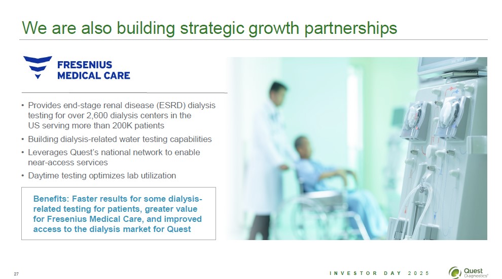 We are also building strategic growth partnerships Fresenius Medical Care Provides end-stage renal disease (ESRD) dialysis testing for over 2,600 dialysis centers in the US serving more than 200K patients Building dialysis-related water testing capabilities Leverage Quest's national network to enable near-access services Daytime testing optimizes lab utilization Benefits: Faster results for some dialysis-related testing for patients, greater value for Fresenius Medical Care, and improved access to the dialysis market for Quest 27 Investor Day 2025 Quest Diagnostics