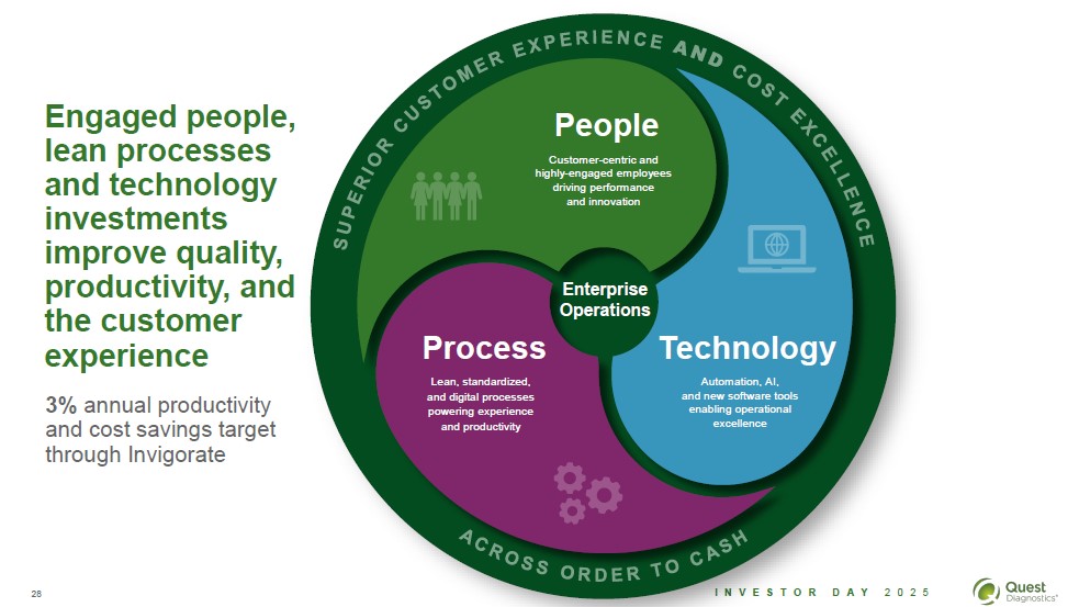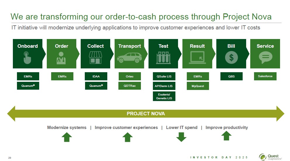 Engaged people, lean processes and technology investments improve quality, productivity, and the customer experience 3% annual productivity and cost savings target through Invigorate Superior customer experience and cost excellence People Customer-centric and highly-engaged employees driving performance and innovation Enterprise Operations Process Lean, standardized, and digital processes powering experience and productivity Technology Automation, AI, and new software tools enabling operational excellence Across order to cash 28 Investor Day 2025 Quest Diagnostics