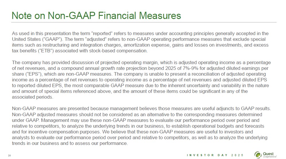 Note on Non-GAAP Financial Measures As used in this presentation the term "reported" refers to measures under accounting principles generally accepted in the United States ("GAAP"). The term "adjusted" refers to non-GAAP operating performance measures that exclude special items such as restructuring and integration charges, amortization expense, gains and losses on investments, and excess tax benefits ("ETB") associated with stock-based compensation. The company has provided discussion of projected operating margin, which is adjusted operating income as a percentage of net revenues, and a compound annual growth rate projection beyond 2025 of 7%-9% for adjusted diluted earnings per share ("EPS"), which are non-GAAP measures. The company is unable to present a reconciliation of adjusted operating income as a percentage of net revenues to operating income as a percentage of net revenues and adjusted diluted EPS to reported diluted EPS, the most comparable GAAP measure due to the inherent uncertainty and variability in the nature and amount of special items referenced above, and the amount of these items could be significant in any of the associated periods. The company has provided a compound annual growth rate projection beyond 2025 of 7%-9% for adjusted diluted earnings per share ("EPS"), which is a non-GAAP measure. The company is unable to present a reconciliation of adjusted diluted EPS to reported diluted EPS, the most comparable GAAP measure due to the inherent uncertainty and variability in the nature and amount of special items referenced above, and the amount of these items could be significant in any of the associated periods. Non-GAAP adjusted measures are presented because management believes those measures are useful adjuncts to GAAP results. Non-GAAP adjusted measures should not be considered as an alternative to the corresponding measures determined under GAAP. Management may use these non-GAAP measures to evaluate our performance period over period and relative to competitors, to analyze the underlying trends in our business, to establish operational budgets and forecasts and for incentive compensation purposes. We believe that these non-GAAP measures are useful to investors and analysts to evaluate our performance period over period and relative to competitors, as well as to analyze the underlying trends in our business and to assess our performance. 31 Investor Day 2025 Quest Diagnostics