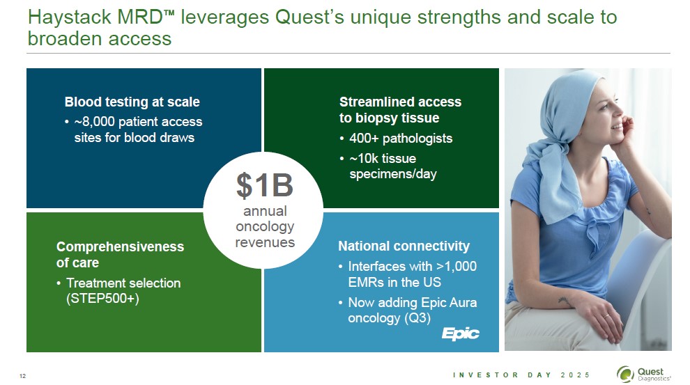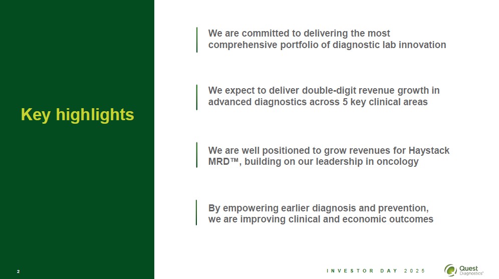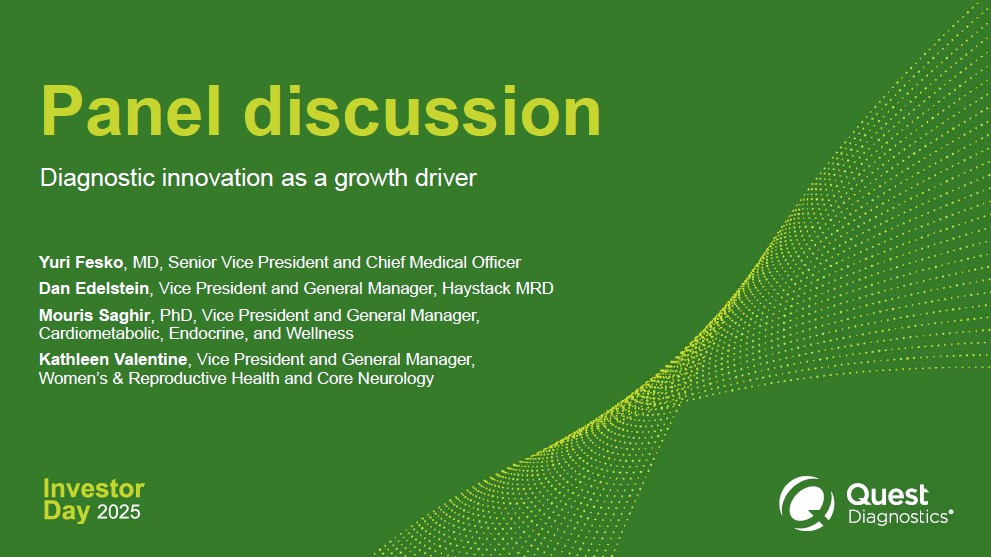 Diagnostic innovation as a growth driver Yuri Fesko, MD, Senior Vice President and Chief Medical Officer Dan Edelstein, Vice President and General Manager, Haystack MRD Mouris Saghir, PhD, Vice President and General Manager, Cardiometabolic, Endocrine, and Wellness Kathleen Valentine, Vice President and General Manager, Women's and Reproductive Health and Core Neurology Panel discussion Investor Day 2025 Quest Diagnostics