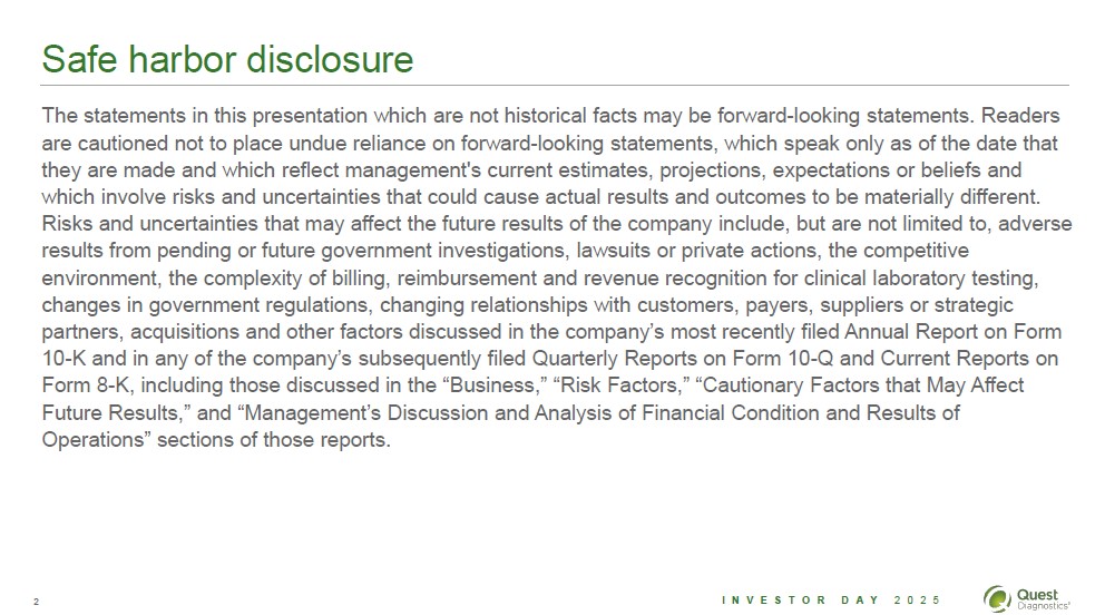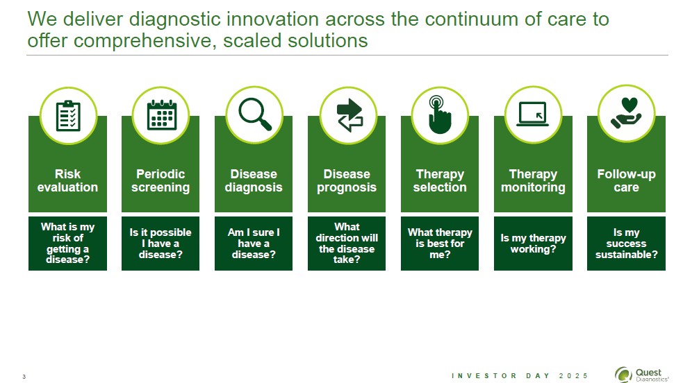 2 INVESTOR DAY 2025 Quest Diagnostics Safe harbor disclosure The statements in this presentation which are not historical facts may be forward-looking statements. Readers are cautioned not to place undue reliance on forward-looking statements, which speak only as of the date that they are made and which reflect management's current estimates, projections, expectations or beliefs and which involve risks and uncertainties that could cause actual results and outcomes to be materially different. Risks and uncertainties that may affect the future results of the company include, but are not limited to, adverse results from pending or future government investigations, lawsuits or private actions, the competitive environment, the complexity of billing, reimbursement and revenue recognition for clinical laboratory testing, changes in government regulations, changing relationships with customers, payers, suppliers or strategic partners, acquisitions and other factors discussed in the company's most recently filed Annual Report on Form 10-K and in any of the company's subsequently filed Quarterly Reports on Form 10-Q and Current Reports on Form 8-K, including those discussed in the "Business," "Risk Factors," "Cautionary Factors that May Affect Future Results," and "Management's Discussion and Analysis of Financial Condition and Results of Operations" sections of those reports.