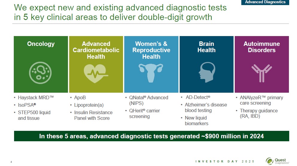 3 INVESTOR DAY 2025 Quest Diagnostics We deliver diagnostic innovation across the continuum of care to offer comprehensive, scaled solutions Risk evaluation Periodic screening Disease diagnosis Therapy selection Therapy monitoring Follow-up care What is my risk of getting a disease? Is it possible I have a disease? Am I sure I have a disease? What therapy is best for me? Is my therapy working? Is my success sustainable? Disease prognosis What direction will the disease take?