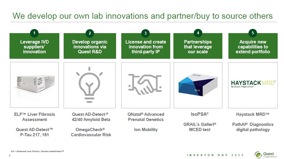 4 INVESTOR DAY 2025 Quest Diagnostics Oncology Advanced Cardiometabolic Health Women's and Reproductive Health Brain Health Autoimmune Disorders We expect new and existing advanced diagnostic tests in 5 key clinical areas to deliver double-digit growth Haystack MRD IsoPSA STEP500 liquid and tissue QNatal Advanced (NIPS) QHerit carrier screening AD-Detect Alzheimer's disease blood testing New liquid biomarkers ANAlyzeR primary care screening Therapy guidance (RA, IBD) In these 5 areas, advanced diagnostic tests generated ~$900 million in 2024 ApoB Lipoprotein(a) Insulin Resistance Panel with Score Advanced Diagnostics