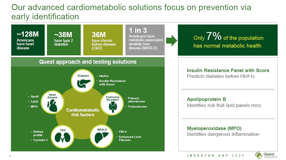 Our advanced cardiometabolic solutions focus on prevention via early identification ~128M Americans have heart disease ~38M have type 2 diabetes 36M have chronic kidney disease (CKD) 1 in 3 Americans have metabolic-associated steatotic liver disease (MASLD) Only 7% of the population has normal metabolic health Quest approach and testing solutions HbA1c Insulin Resistance with Score FIB-4 Enhanced Liver Fibrosis Kidney profile Cystatin C ApoB Lp(a) MPO Primary aldosterone Testosterone Diabetes Heart disease Endocrine disorders MASLD CKD Insulin Resistance Panel with Score Predicts diabetes before HbA1c Apolipoprotein B Identifies risk that lipid panels miss Myeloperoxidase (MPO) Identifies dangerous inflammation 7 INVESTOR DAY 2025 Quest Diagnostics