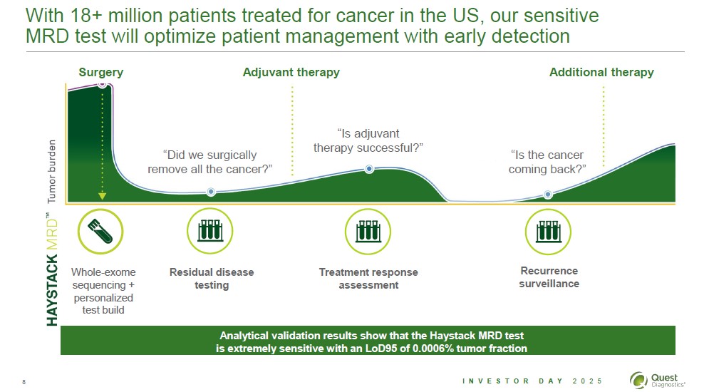 With 18+ million patients treated for cancer in the US, our sensitive MRD test will optimize patient management with early detection Surgery Adjuvant therapy Additional therapy "Is adjuvant therapy successful?" Whole-exome sequencing + personalized test build Treatment response assessment Residual disease testing Recurrence surveillance Analytical validation results show that the Haystack MRD testis extremely sensitive with an LoD95 of 0.0006% tumor fraction "Is the cancer coming back?" "Did we surgically remove all the cancer?" HAYSTACK MRD Tumor burden 8 INVESTOR DAY 2025 Quest Diagnostics