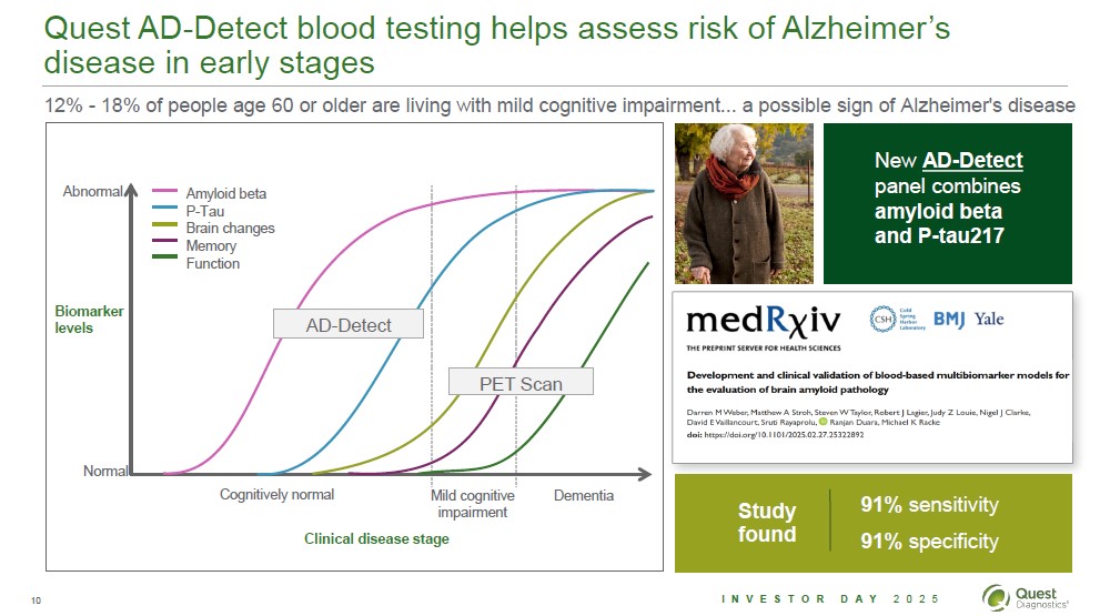 Quest AD-Detect blood testing helps assess risk of Alzheimer's disease in early stages 12% - 18% of people age 60 or older are living with mild cognitive impairment... a possible sign of Alzheimer's disease New AD-Detect panel combines amyloid beta and P-tau217 Normal Abnormal Cognitively normal Mild cognitive impairment Dementia Clinical disease stage Biomarker levels Amyloid beta P-Tau Brain changes Memory Function PET Scan AD-Detect Study found 91% sensitivity 91% specificity medRxiv CSH Cold Spring Harbor BMJ Yale THE PREPRINT SERVER FOR HEALTH SCIENCES Development and clinical validation of blood-based multibiomarker models for the evaluation of brain amyloid pathology Darren M Weber, Matthew A Stroh, Steven W Taylor, Robert J Lagier, Judy Z Louie, Nigel J Clarke, David E Vaillancourt, Sruti Rayaprolu, ID Ranjan Duara, Michael K Racke doi: https://doi.org/10.1101/2025.02.27.25322892 10 INVESTOR DAY 2025 Quest Diagnostics