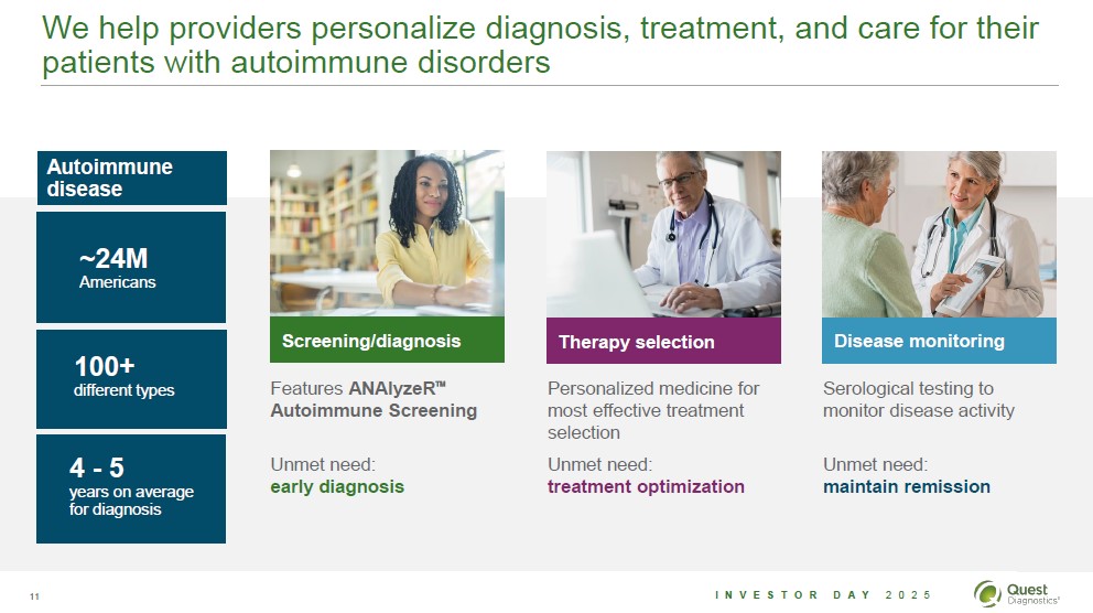 11 INVESTOR DAY 2025 Quest Diagnostics We help providers personalize diagnosis, treatment, and care for their patients with autoimmune disorders Features ANAlyzeR Autoimmune Screening Unmet need: early diagnosis Screening/diagnosis Personalized medicine for most effective treatment selection Unmet need: treatment optimization Therapy selection Serological testing to monitor disease activity Unmet need: maintain remission Disease monitoring ~24M Americans 100+ different types 4 - 5 years on average for diagnosis Autoimmune disease