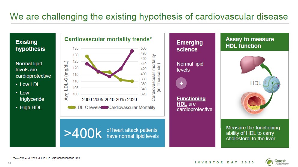 We are challenging the existing hypothesis of cardiovascular disease >400k Normal lipid levels are cardioprotective Low LDL Low triglyceride High HDL Existing hypothesis Normal lipid levels + Functioning HDL are cardioprotective Emerging science However Measure the functioning ability of HDL to carry cholesterol to the liver HDL Assay to measure HDL function Cardiovascular mortality trends* 320 340 360 380 400 420 440 460 480 500 100 105 110 115 120 125 130 135 2000 2005 2010 2015 2020 Cardiovascular mortality (in Thousands) Avg LDL-C (mg/dL) LDL-C levels Cardiovascular Mortality of heart attack patients have normal lipid levels * Tsao CW, et al. 2023. doi:10.1161/CIR.0000000000001123 13 INVESTOR DAY 2025 Quest Diagnostics