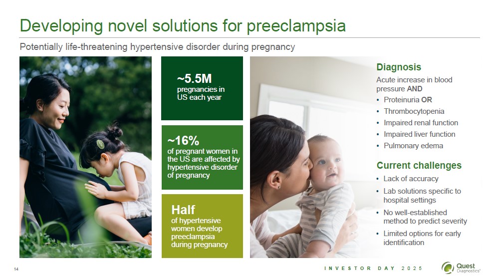 Developing novel solutions for preeclampsia Potentially life-threatening hypertensive disorder during pregnancy ~16% of pregnant women in the US are affected by hypertensive disorder of pregnancy Half of hypertensive women develop preeclampsia during pregnancy ~5.5M pregnancies in US each year Diagnosis Acute increase in blood pressure AND Proteinuria OR Thrombocytopenia Impaired renal function Impaired liver function Pulmonary edema Current challenges Lack of accuracy Lab solutions specific to hospital settings No well-established method to predict severity Limited options for early Identification 14 INVESTOR DAY 2025 Quest Diagnostics