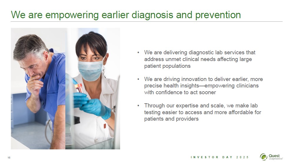 15 INVESTOR DAY 2025 Quest Diagnostics We are empowering earlier diagnosis and prevention We are delivering diagnostic lab services that address unmet clinical needs affecting large patient populations We are driving innovation to deliver earlier, more precise health insights-empowering clinicians with confidence to act sooner Through our expertise and scale, we make lab testing easier to access and more affordable for patients and providers