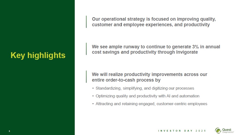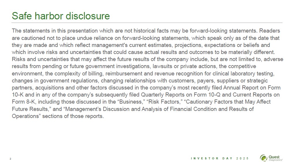2 INVESTOR DAY 2025 Quest Diagnostics Safe harbor disclosure The statements in this presentation which are not historical facts may be forward-looking statements. Readers are cautioned not to place undue reliance on forward-looking statements, which speak only as of the date that they are made and which reflect management's current estimates, projections, expectations or beliefs and which involve risks and uncertainties that could cause actual results and outcomes to be materially different. Risks and uncertainties that may affect the future results of the company include, but are not limited to, adverse results from pending or future government investigations, lawsuits or private actions, the competitive environment, the complexity of billing, reimbursement and revenue recognition for clinical laboratory testing, changes in government regulations, changing relationships with customers, payers, suppliers or strategic partners, acquisitions and other factors discussed in the company's most recently filed Annual Report on Form 10-K and in any of the company's subsequently filed Quarterly Reports on Form 10-Q and Current Reports on Form 8-K, including those discussed in the "Business," "Risk Factors," "Cautionary Factors that May Affect Future Results," and "Management's Discussion and Analysis of Financial Condition and Results of Operations" sections of those reports.