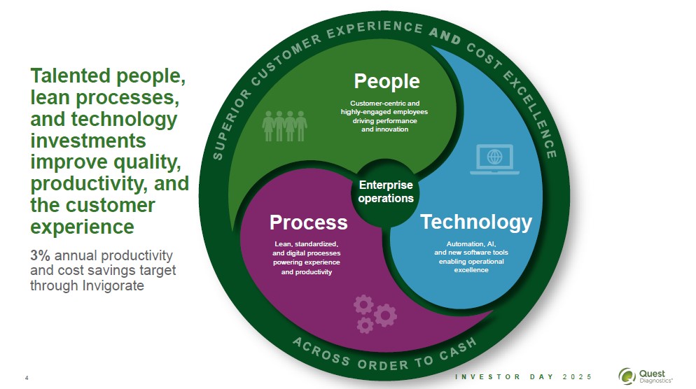 3 INVESTOR DAY 2025 Quest Diagnostics Key highlights Our operational strategy is focused on improving quality, customer and employee experiences, and productivity We see ample runway to continue to generate 3% in annual cost savings and productivity through Invigorate We will realize productivity improvements across our entire order-to-cash process by Standardizing, simplifying, and digitizing our processes Optimizing quality and productivity with AI and automation Attracting and retaining engaged, customer-centric employees