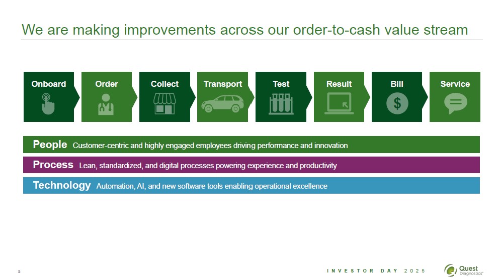 4 INVESTOR DAY 2025 Quest Diagnostics 3% annual productivity and cost savings target through Invigorate People Customer-centric and highly-engaged employees driving performance and innovation Technology Automation, AI, and new software tools enabling operational excellence Process Lean, standardized, and digital processes powering experience and productivity Enterprise operations Talented people, lean processes, and technology investments improve quality, productivity, and the customer experience SUPERIOR CUSTOMER EXPERIENCE AND COST EXCELLENCE ACROSS ORDER TO CASH