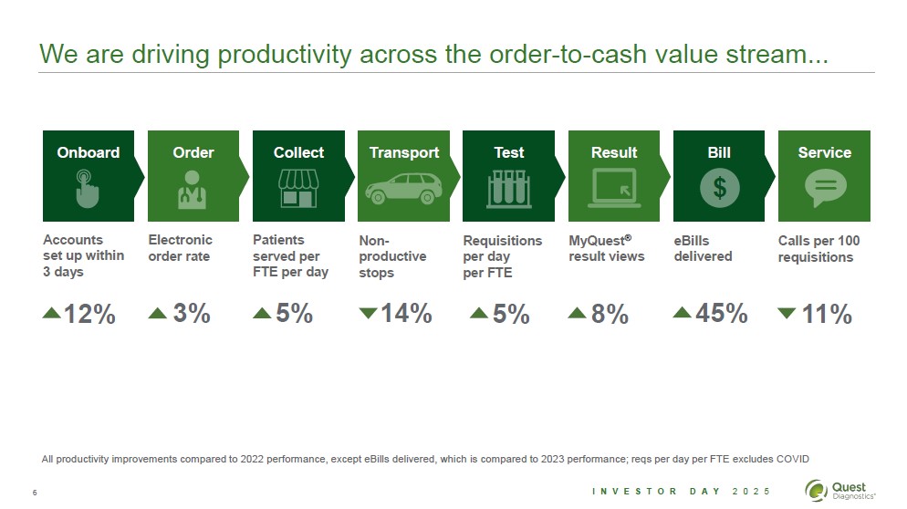 5 INVESTOR DAY 2025 Quest Diagnostics We are making improvements across our order-to-cash value stream People Customer-centric and highly engaged employees driving performance and innovation Process Lean, standardized, and digital processes powering experience and productivity Technology Automation, AI, and new software tools enabling operational excellence Onboard Order Collect Test Result Bill Service $ Transport