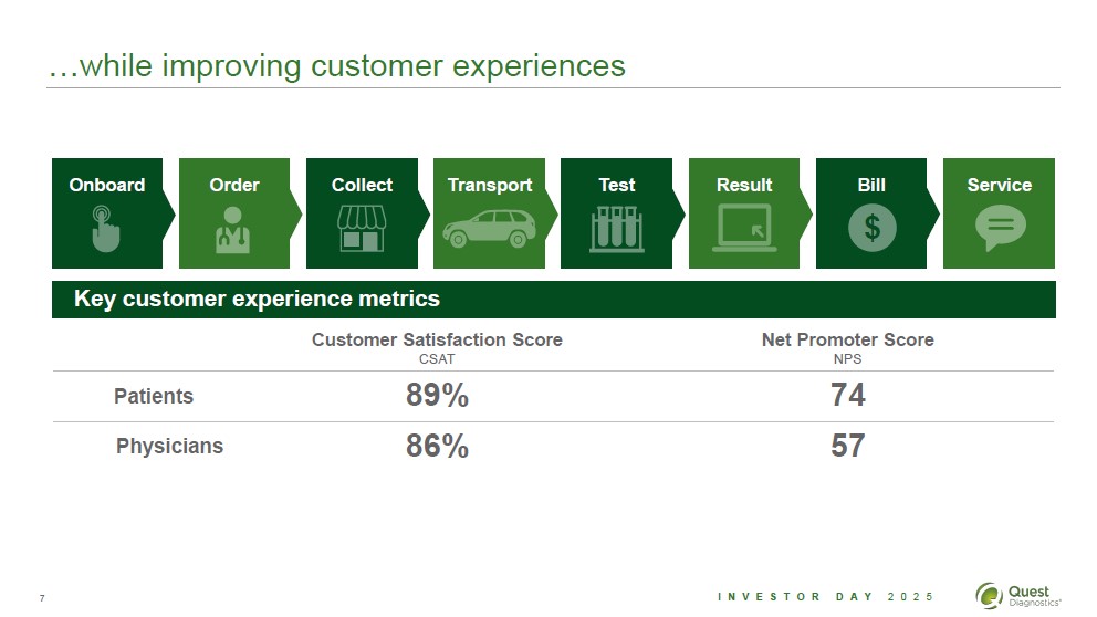 6 INVESTOR DAY 2025 Quest Diagnostics We are driving productivity across the order-to-cash value stream... 5% 14% 5% 11% 3% 8% 45% 12% All productivity improvements compared to 2022 performance, except eBills delivered, which is compared to 2023 performance; reqs per day per FTE excludes COVID Patients served per FTE per day Non-productive stops Requisitions per day per FTE Calls per 100 requisitions Accounts set up within 3 days Electronic order rate MyQuest result views eBills delivered Onboard Order Collect Test Result Bill Service $ Transport