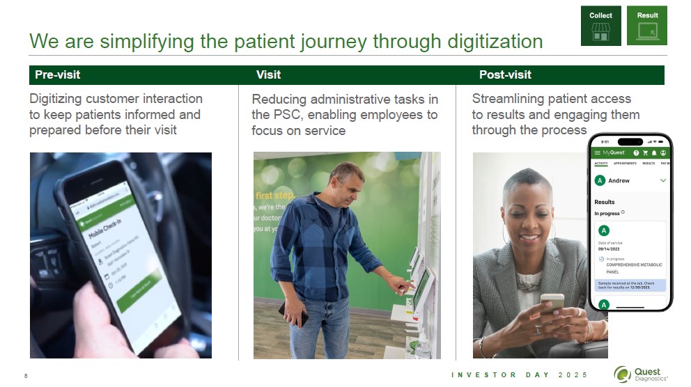7 INVESTOR DAY 2025 Quest Diagnostics …while improving customer experiences Customer Satisfaction Score CSAT Net Promoter Score NPS Patients 89% 74 Physicians 86% 57 Key customer experience metrics Onboard Order Collect Test Result Bill Service $ Transport