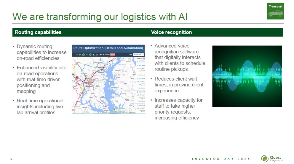 8 INVESTOR DAY 2025 Quest Diagnostics We are simplifying the patient journey through digitization Digitizing customer interaction to keep patients informed and prepared before their visit Reducing administrative tasks in the PSC, enabling employees to focus on service Streamlining patient access to results and engaging them through the process Pre-visit Visit Post-visit Collect Result MyQuest A Andrew Results In progress A A