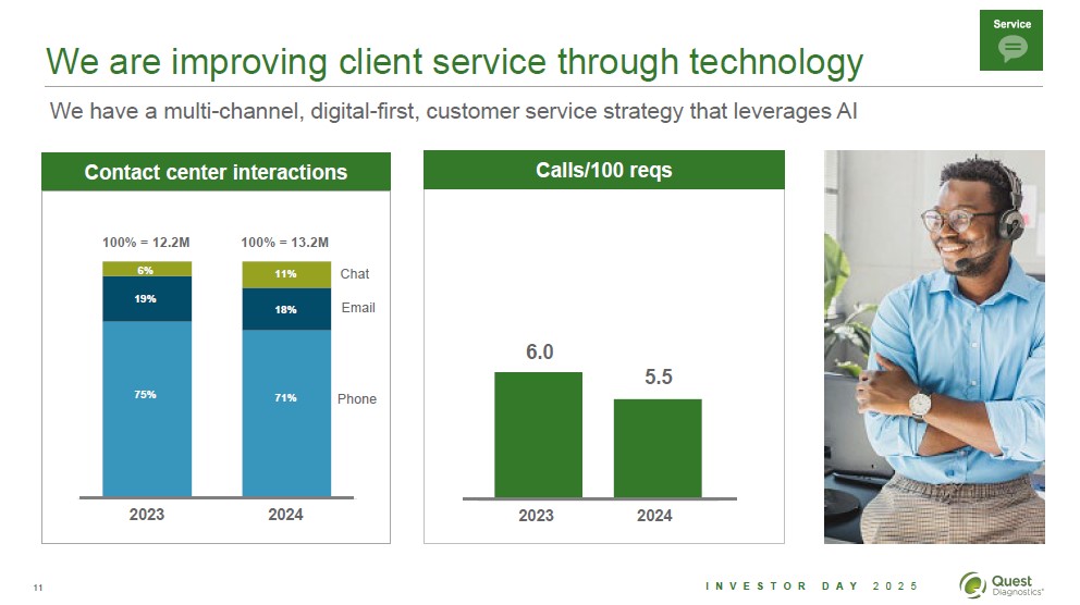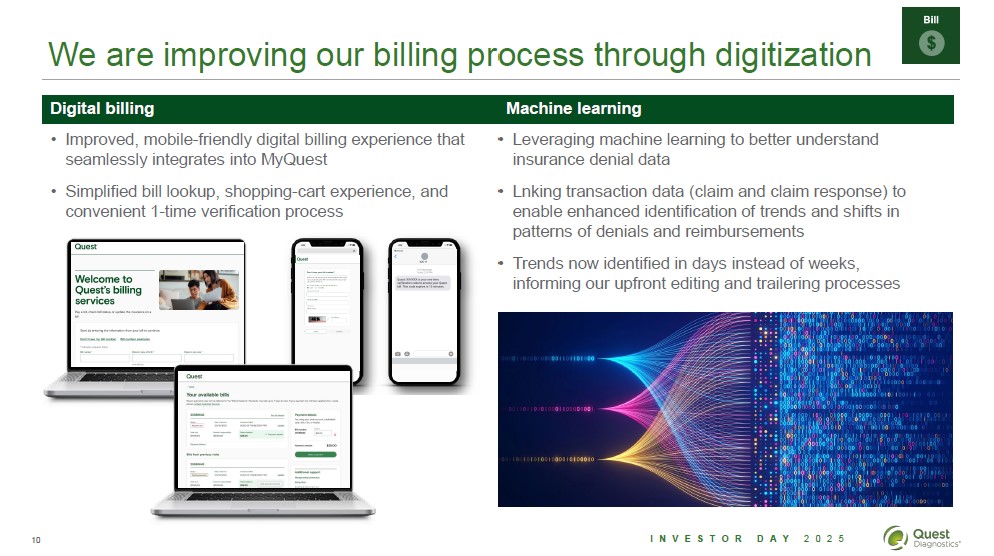 10 INVESTOR DAY 2025 Quest Diagnostics We are improving our billing process through digitization Bill $ Quest Welcome to Quest's billing services Leveraging machine learning to better understand insurance denial data Lnking transaction data (claim and claim response) to enable enhanced identification of trends and shifts in patterns of denials and reimbursements Trends now identified in days instead of weeks, informing our upfront editing and trailering processes Improved, mobile-friendly digital billing experience that seamlessly integrates into MyQuest Simplified bill lookup, shopping-cart experience, and convenient 1-time verification process Digital billing Machine learning