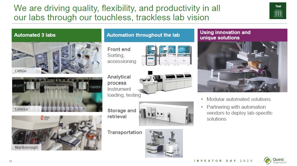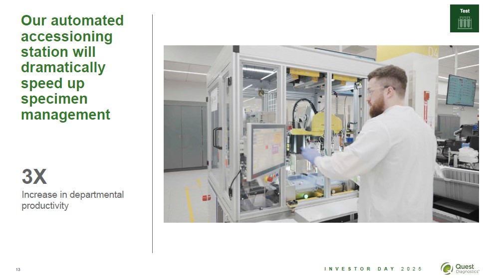 12 INVESTOR DAY 2025 Quest Diagnostics We are driving quality, flexibility, and productivity in all our labs through our touchless, trackless lab vision Test Automated 3 labs Automation throughout the lab Front end Sorting, accessioning Analytical process Instrument loading, testing Storage and retrieval Transportation Using innovation and unique solutions Modular automated solutions Partnering with automation vendors to deploy lab-specific solutions Clifton Lenexa Marlborough