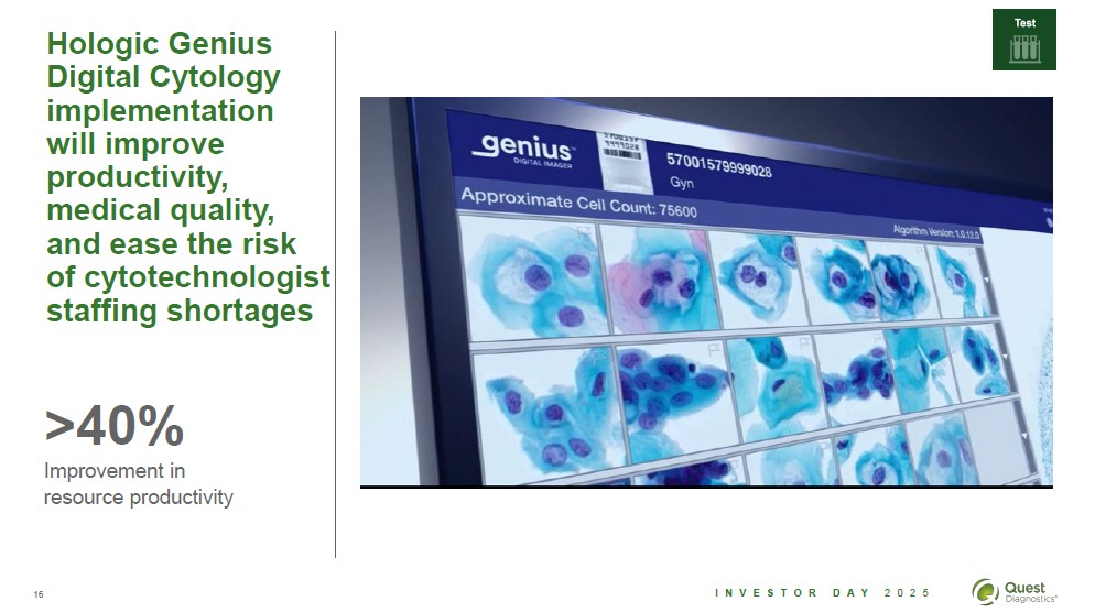 15 INVESTOR DAY 2025 Quest Diagnostics Test QuantiFERON pre-analytical automation eliminates the manual labeling and racking of tubes needed to perform TB testing ~90% reduction in human touches ~2.5X processing speed