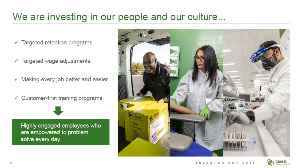 17 INVESTOR DAY 2025 Quest Diagnostics Modernize systems | Improve customer experiences | Lower IT spend | Improve productivity Project Nova We are transforming our order-to-cash process through Project Nova EMRs Ortec QBS EMRs Quanum Salesforce MyQuest QSuite LIS Esoteric/Genetic LIS AP/Derm LIS EMRs IT initiative will modernize underlying applications to improve customer experiences and lower IT costs IDAA QDTRac Onboard Order Collect Test Result Bill Service $ Transport Quanum