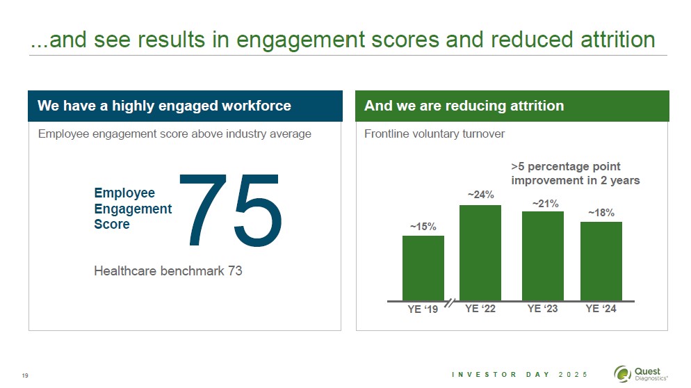 18 INVESTOR DAY 2025 Quest Diagnostics We are investing in our people and our culture... Targeted retention programs Targeted wage adjustments Making every job better and easier Customer-first training programs Highly engaged employees who are empowered to problem solve every day