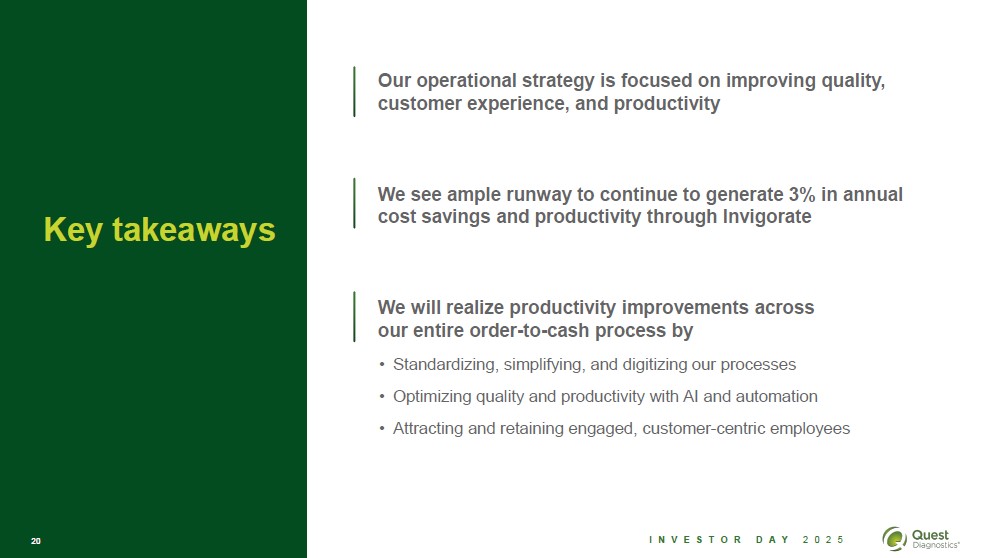 19 INVESTOR DAY 2025 Quest Diagnostics ...and see results in engagement scores and reduced attrition ~15% ~24% ~21% ~18% YE '19 YE '22 YE '23 YE '24 >5 percentage point improvement in 2 years Frontline voluntary turnover We have a highly engaged workforce And we are reducing attrition Employee engagement score above industry average Employee Engagement Score Healthcare benchmark 73 75