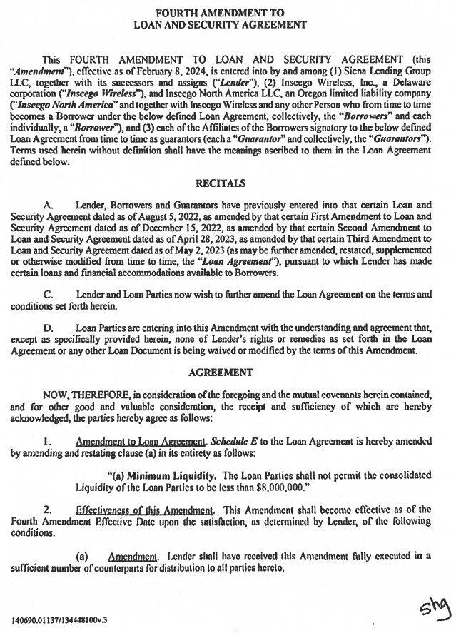 EX-10.1 2 inseego_ex1001.htm FOURTH AMENDMENT, DATED AS OF FEBRUARY 8, 2024, TO LOAN AND SECURITY AGREEMENT, DATED AS OF AUGUST 5, 2022, AMONG SIENA LENDING GROUP LLC (AS LENDER), INSEEGO WIRELESS, INC., AND INSEEGO NORTH AMERICA LLC (AS BORROWERS), AND INSEEGO CORP. (AS GUARANTOR).
