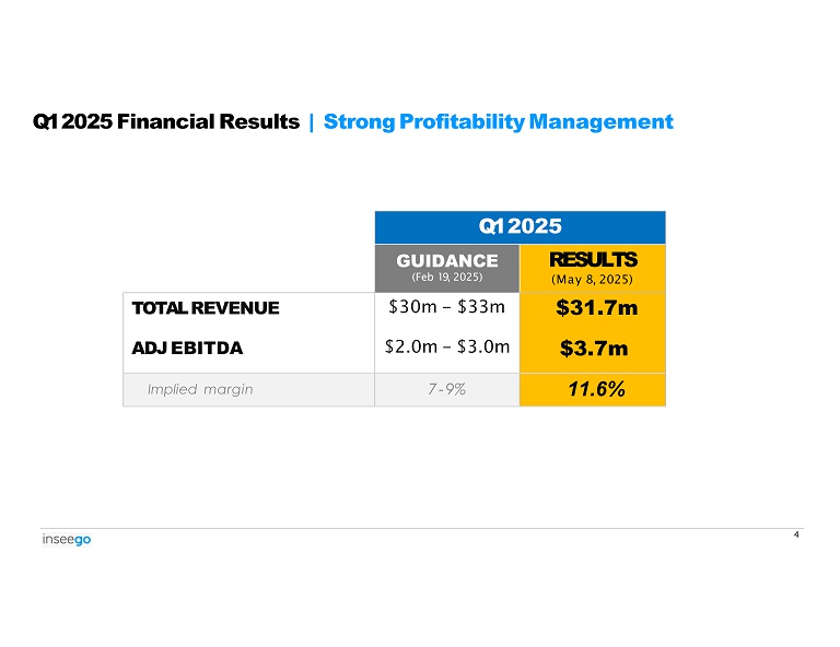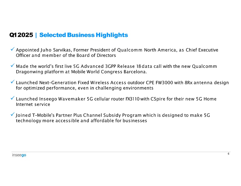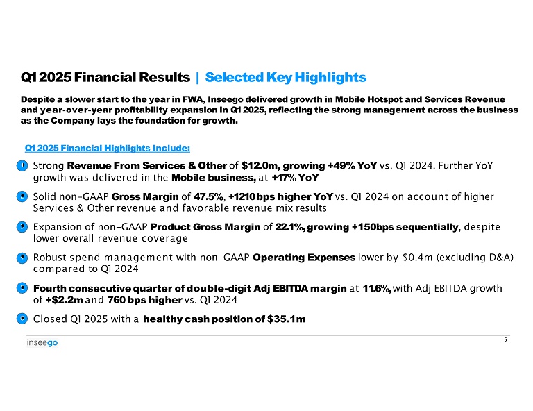 Despite a slower start to the year in FWA, Inseego delivered growth in Mobile Hotspot and Services Revenue and year - over - year profitability expansion in Q1 2025, reflecting the strong management across the business as the Company lays the foundation for growth. Q1 2025 Financial Highlights Include: Strong Revenue From Services & Other of $12.0m, growing +49% YoY vs. Q1 2024. Further YoY growth was delivered in the Mobile business, at +17% YoY Q1 2025 Financial Results | Selected Key Highlights • 1 2 • Solid non - GAAP Gross Margin of 47.5% , +1210 bps higher YoY vs. Q1 2024 on account of higher Services & Other revenue and favorable revenue mix results 3 • Expansion of non - GAAP Product Gross Margin of 22.1%, growing +150bps sequentially , despite lower overall revenue coverage 4 • Robust spend management with non - GAAP Operating Expenses lower by $0.4m (excluding D&A) compared to Q1 2024 5 • Fourth consecutive quarter of double - digit Adj EBITDA margin at 11.6%, with Adj EBITDA growth of +$2.2m and 760 bps higher vs. Q1 2024 6 • Closed Q1 2025 with a healthy cash position of $35.1m 5