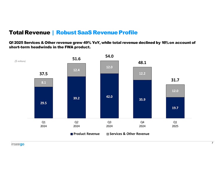 x Appointed Juho Sarvikas, Former President of Qualcomm North America, as Chief Executive Officer and member of the Board of Directors x Made the world’s first live 5G Advanced 3GPP Release 18 data call with the new Qualcomm Dragonwing platform at Mobile World Congress Barcelona. x Launched Next - Generation Fixed Wireless Access outdoor CPE FW3000 with 8Rx antenna design for optimized performance, even in challenging environments x Launched Inseego Wavemaker 5G cellular router FX3110 with CSpire for their new 5G Home Internet service x Joined T - Mobile's Partner Plus Channel Subsidy Program which is designed to make 5G technology more accessible and affordable for businesses 6 Q1 2025 | Selected Business Highlights