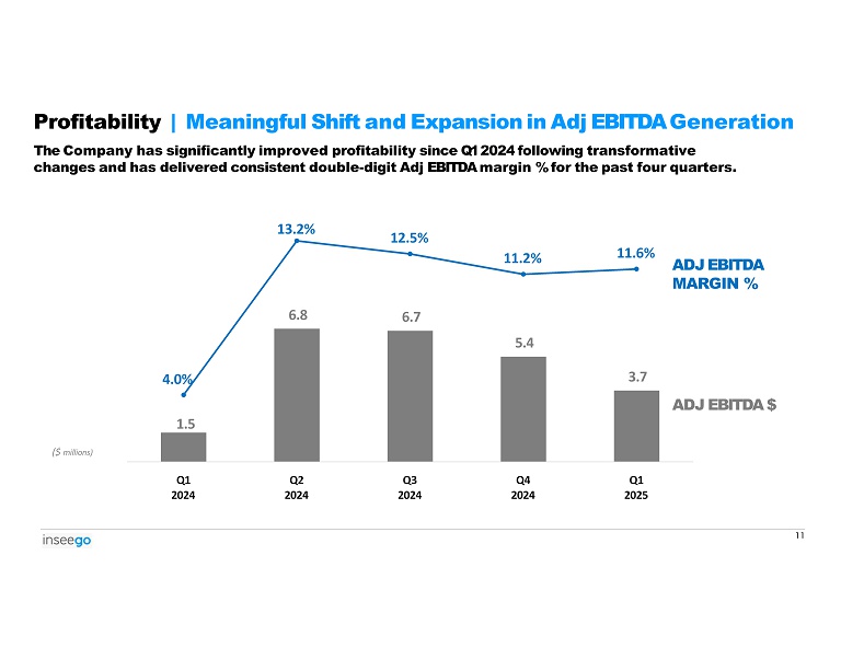 1.5 11 6.8 6.7 5.4 3.7 4.0% 13.2% 12.5% 11.2% 11.6% Q1 2024 Q2 2024 Q3 2024 Q4 2024 Q1 2025 Profitability | Meaningful Shift and Expansion in Adj EBITDA Generation The Company has significantly improved profitability since Q1 2024 following transformative changes and has delivered consistent double - digit Adj EBITDA margin % for the past four quarters. ADJ EBITDA MARGIN % ADJ EBITDA $ ($ millions)