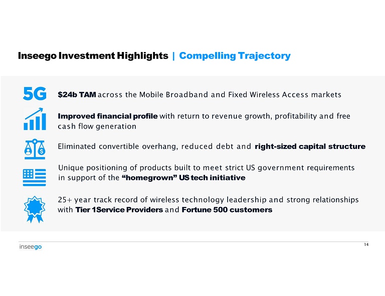Successful Reduction in Debt | Convertible Notes Fully Repaid May 1, 2025 TOTAL DEBT OUTSTANDING • On May 1, 2025, Inseego repaid the remaining $15m stub outstanding on the Company's convertible notes. • Including debt restructurings that occurred in 2024, the Company has lowered its debt position by $125m since January 2024. • The Company's only outstanding debt is $41m in new long - term Senior Secured 9% Notes which mature May 1, 2029. • Pro Forma Net Debt of the Company is $21m $41m New Senior Secured Debt $20m Pro Forma Cash ($35m Cash on Mar 31st less $15m Convertible Notes stub paid - off on May 1st) 12 = $21m NET DEBT -