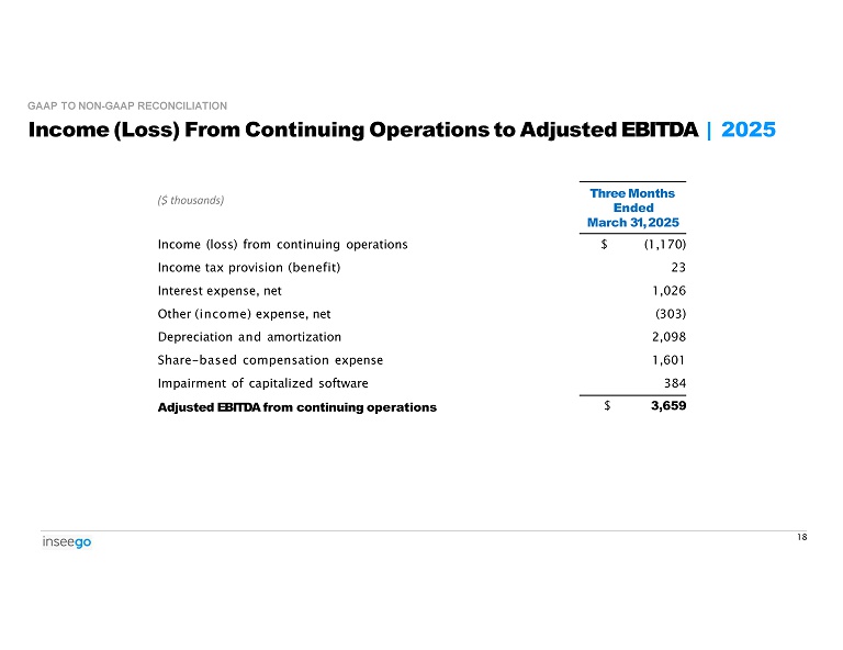 Income (Loss) From Continuing Operations to Adjusted EBITDA | 2025 GAAP TO NON - GAAP RECONCILIATION $ (1,170) Income (loss) from continuing operations 23 Income tax provision (benefit) 1,026 Interest expense, net (303) Other (income) expense, net 2,098 Depreciation and amortization 1,601 Share - based compensation expense 384 Impairment of capitalized software $ 3,659 Adjusted EBITDA from continuing operations Three Months Ended March 31, 2025 18 ($ thousands)