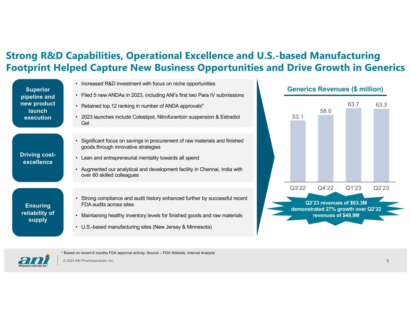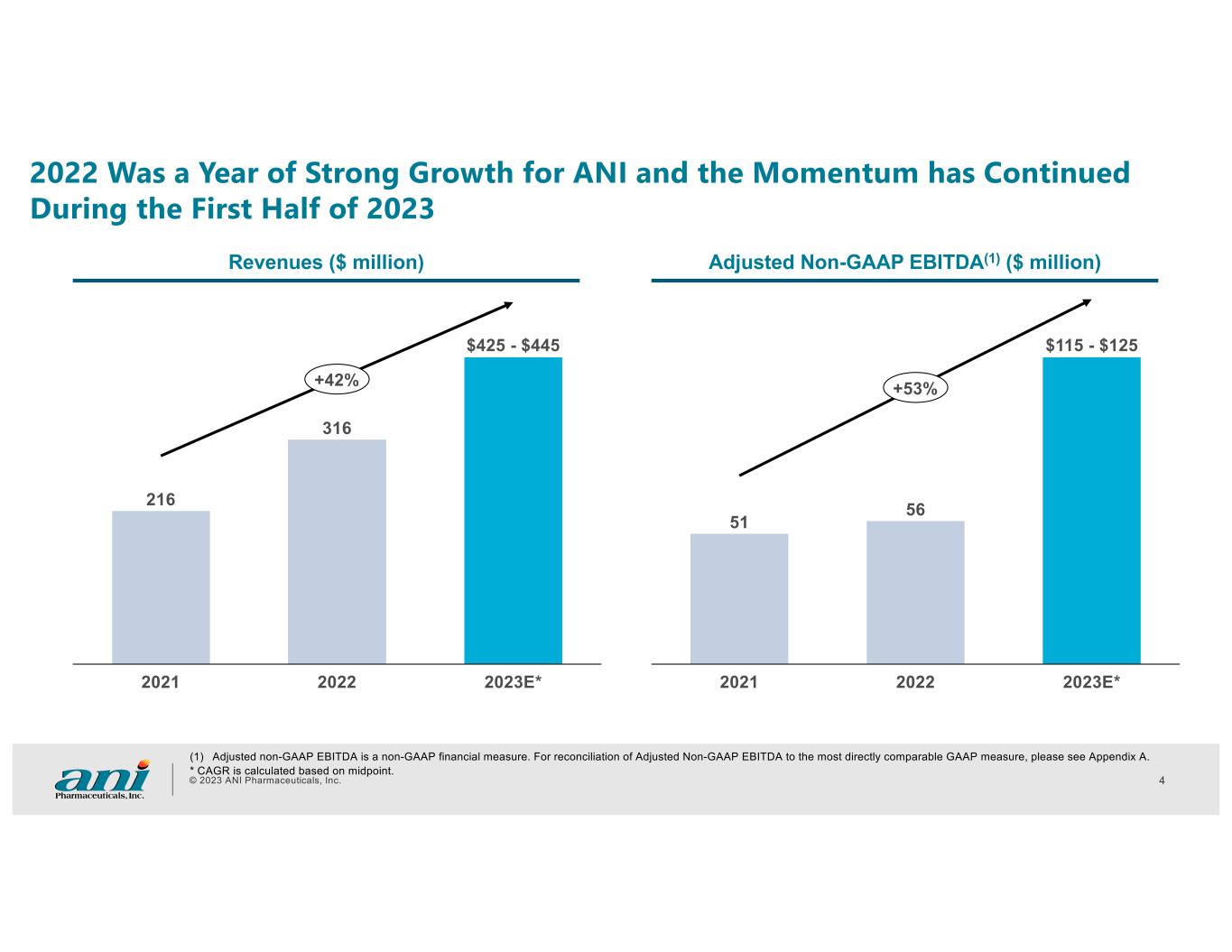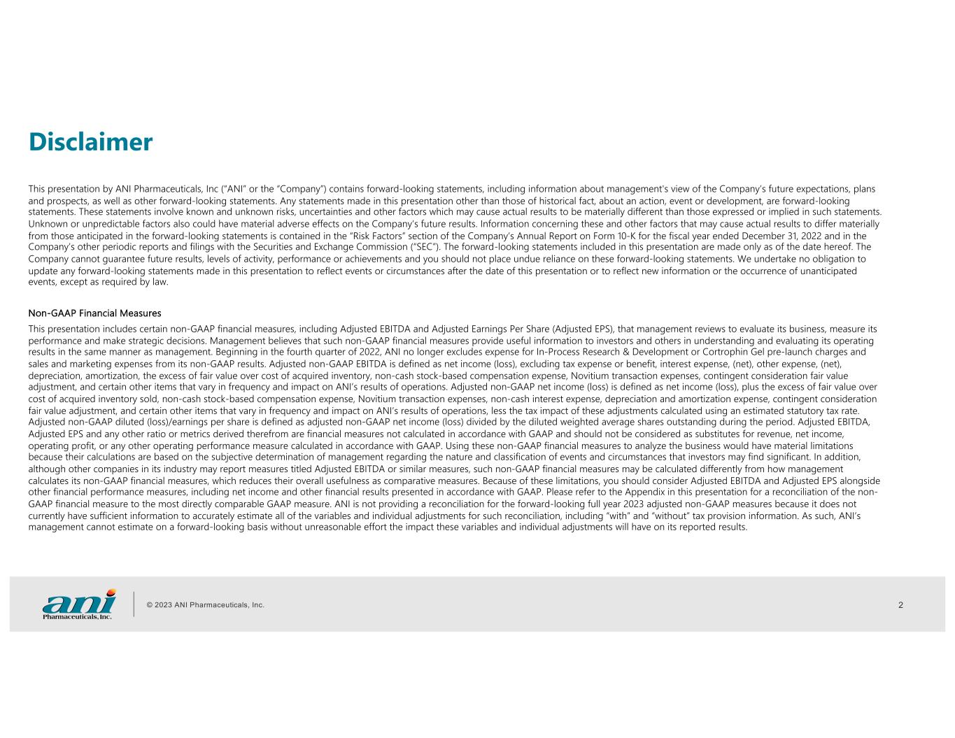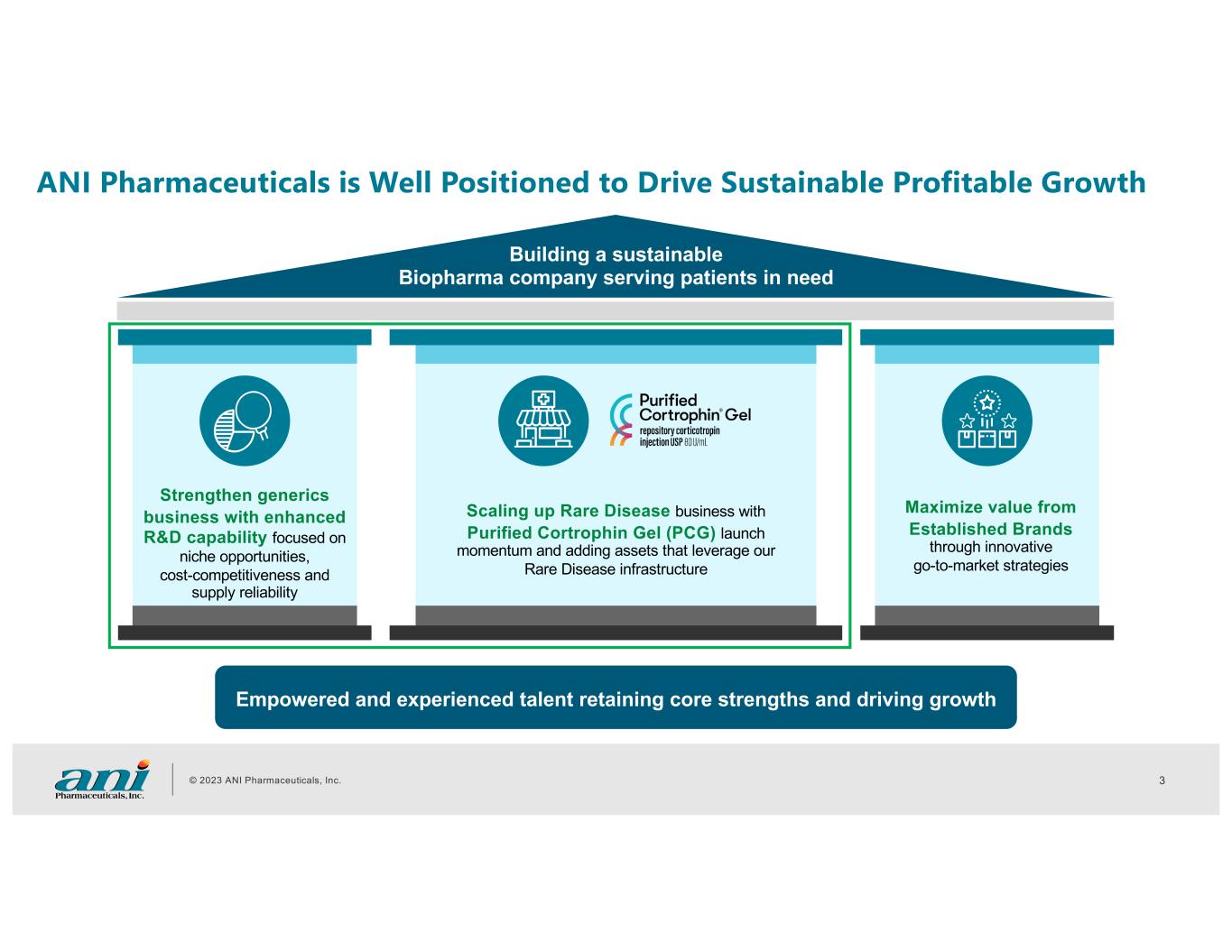© 2023 ANI Pharmaceuticals, Inc. 2 Disclaimer This presentation by ANI Pharmaceuticals, Inc (“ANI” or the “Company”) contains forward-looking statements, including information about management's view of the Company’s future expectations, plans and prospects, as well as other forward-looking statements. Any statements made in this presentation other than those of historical fact, about an action, event or development, are forward-looking statements. These statements involve known and unknown risks, uncertainties and other factors which may cause actual results to be materially different than those expressed or implied in such statements. Unknown or unpredictable factors also could have material adverse effects on the Company’s future results. Information concerning these and other factors that may cause actual results to differ materially from those anticipated in the forward-looking statements is contained in the “Risk Factors” section of the Company’s Annual Report on Form 10-K for the fiscal year ended December 31, 2022 and in the Company’s other periodic reports and filings with the Securities and Exchange Commission (“SEC”). The forward-looking statements included in this presentation are made only as of the date hereof. The Company cannot guarantee future results, levels of activity, performance or achievements and you should not place undue reliance on these forward-looking statements. We undertake no obligation to update any forward-looking statements made in this presentation to reflect events or circumstances after the date of this presentation or to reflect new information or the occurrence of unanticipated events, except as required by law. Non-GAAP Financial Measures This presentation includes certain non-GAAP financial measures, including Adjusted EBITDA and Adjusted Earnings Per Share (Adjusted EPS), that management reviews to evaluate its business, measure its performance and make strategic decisions. Management believes that such non-GAAP financial measures provide useful information to investors and others in understanding and evaluating its operating results in the same manner as management. Beginning in the fourth quarter of 2022, ANI no longer excludes expense for In-Process Research & Development or Cortrophin Gel pre-launch charges and sales and marketing expenses from its non-GAAP results. Adjusted non-GAAP EBITDA is defined as net income (loss), excluding tax expense or benefit, interest expense, (net), other expense, (net), depreciation, amortization, the excess of fair value over cost of acquired inventory, non-cash stock-based compensation expense, Novitium transaction expenses, contingent consideration fair value adjustment, and certain other items that vary in frequency and impact on ANI’s results of operations. Adjusted non-GAAP net income (loss) is defined as net income (loss), plus the excess of fair value over cost of acquired inventory sold, non-cash stock-based compensation expense, Novitium transaction expenses, non-cash interest expense, depreciation and amortization expense, contingent consideration fair value adjustment, and certain other items that vary in frequency and impact on ANI’s results of operations, less the tax impact of these adjustments calculated using an estimated statutory tax rate. Adjusted non-GAAP diluted (loss)/earnings per share is defined as adjusted non-GAAP net income (loss) divided by the diluted weighted average shares outstanding during the period. Adjusted EBITDA, Adjusted EPS and any other ratio or metrics derived therefrom are financial measures not calculated in accordance with GAAP and should not be considered as substitutes for revenue, net income, operating profit, or any other operating performance measure calculated in accordance with GAAP. Using these non-GAAP financial measures to analyze the business would have material limitations because their calculations are based on the subjective determination of management regarding the nature and classification of events and circumstances that investors may find significant. In addition, although other companies in its industry may report measures titled Adjusted EBITDA or similar measures, such non-GAAP financial measures may be calculated differently from how management calculates its non-GAAP financial measures, which reduces their overall usefulness as comparative measures. Because of these limitations, you should consider Adjusted EBITDA and Adjusted EPS alongside other financial performance measures, including net income and other financial results presented in accordance with GAAP. Please refer to the Appendix in this presentation for a reconciliation of the non- GAAP financial measure to the most directly comparable GAAP measure. ANI is not providing a reconciliation for the forward-looking full year 2023 adjusted non-GAAP measures because it does not currently have sufficient information to accurately estimate all of the variables and individual adjustments for such reconciliation, including “with” and “without” tax provision information. As such, ANI’s management cannot estimate on a forward-looking basis without unreasonable effort the impact these variables and individual adjustments will have on its reported results.
