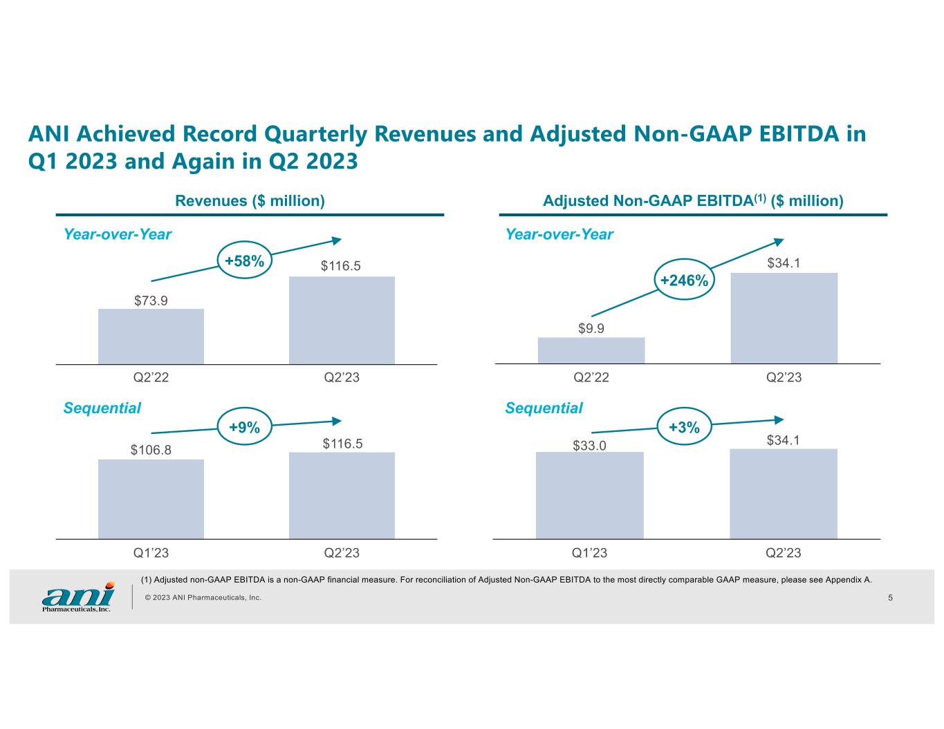 © 2023 ANI Pharmaceuticals, Inc. 4 2022 Was a Year of Strong Growth for ANI and the Momentum has Continued During the First Half of 2023 (1) Adjusted non-GAAP EBITDA is a non-GAAP financial measure. For reconciliation of Adjusted Non-GAAP EBITDA to the most directly comparable GAAP measure, please see Appendix A. * CAGR is calculated based on midpoint. Revenues ($ million) Adjusted Non-GAAP EBITDA(1) ($ million) 216 316 20222021 2023E* $425 - $445 +42% 51 56 2021 2022 2023E* $115 - $125 +53%