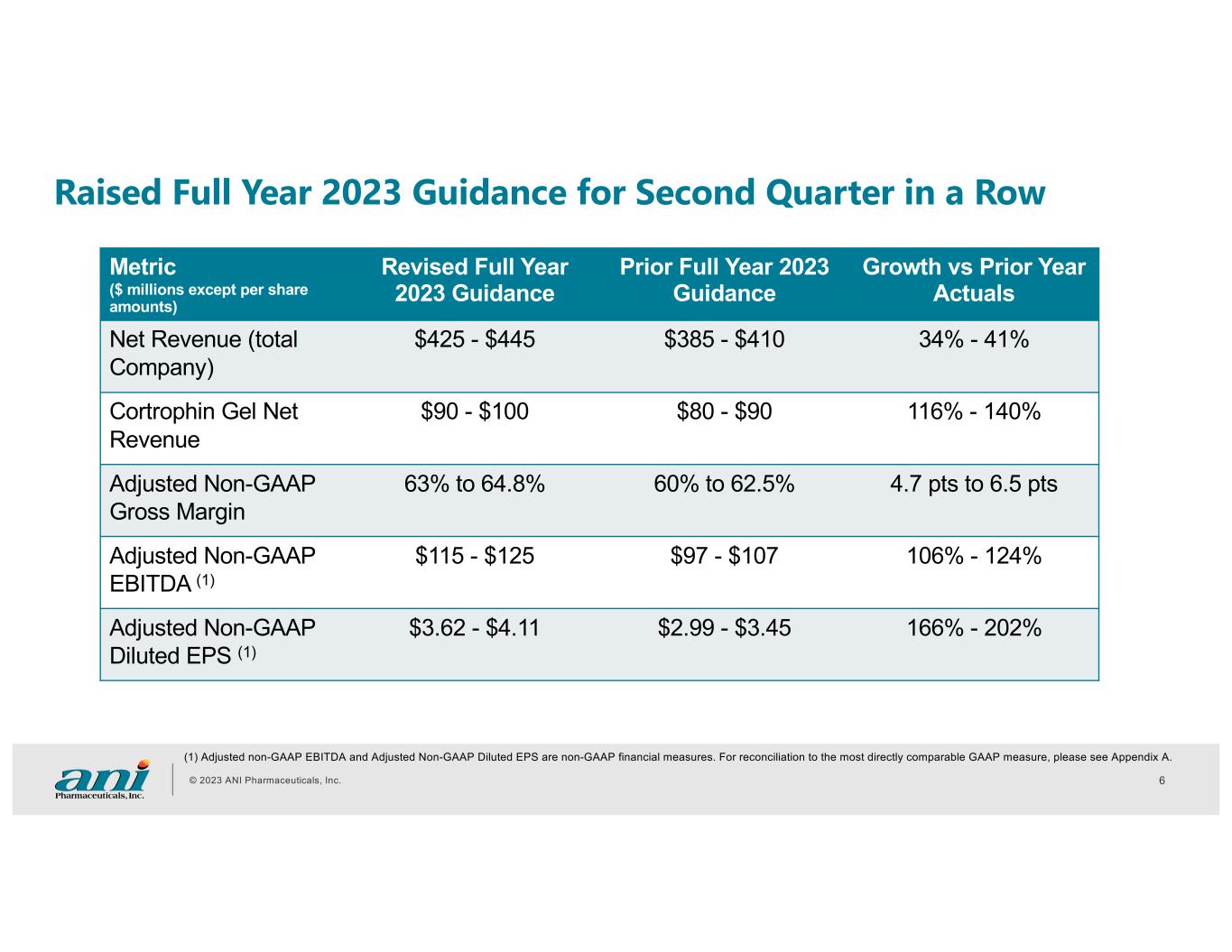 © 2023 ANI Pharmaceuticals, Inc. 5 ANI Achieved Record Quarterly Revenues and Adjusted Non-GAAP EBITDA in Q1 2023 and Again in Q2 2023 Revenues ($ million) Adjusted Non-GAAP EBITDA(1) ($ million) $42 (1) Adjusted non-GAAP EBITDA is a non-GAAP financial measure. For reconciliation of Adjusted Non-GAAP EBITDA to the most directly comparable GAAP measure, please see Appendix A. $73.9 $116.5 Q2’22 Q2’23 $106.8 $116.5 Q1’23 Q2’23 $9.9 $34.1 Q2’22 Q2’23 $33.0 $34.1 Q1’23 Q2’23 Year-over-Year Sequential Year-over-Year Sequential +58% +9% +246% +3%
