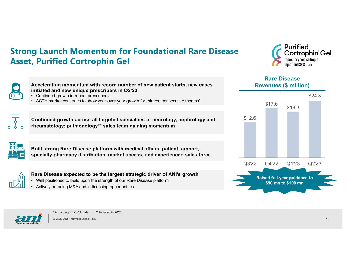 © 2023 ANI Pharmaceuticals, Inc. 6 Raised Full Year 2023 Guidance for Second Quarter in a Row (1) Adjusted non-GAAP EBITDA and Adjusted Non-GAAP Diluted EPS are non-GAAP financial measures. For reconciliation to the most directly comparable GAAP measure, please see Appendix A. Metric ($ millions except per share amounts) Revised Full Year 2023 Guidance Prior Full Year 2023 Guidance Growth vs Prior Year Actuals Net Revenue (total Company) $425 - $445 $385 - $410 34% - 41% Cortrophin Gel Net Revenue $90 - $100 $80 - $90 116% - 140% Adjusted Non-GAAP Gross Margin 63% to 64.8% 60% to 62.5% 4.7 pts to 6.5 pts Adjusted Non-GAAP EBITDA (1) $115 - $125 $97 - $107 106% - 124% Adjusted Non-GAAP Diluted EPS (1) $3.62 - $4.11 $2.99 - $3.45 166% - 202%