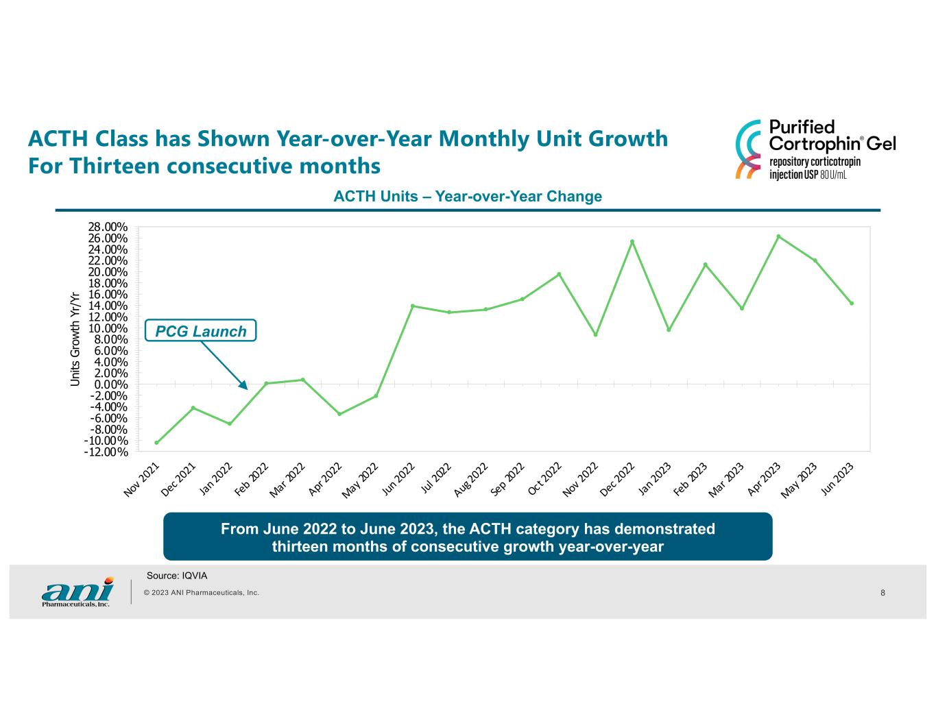 © 2023 ANI Pharmaceuticals, Inc. 7 Strong Launch Momentum for Foundational Rare Disease Asset, Purified Cortrophin Gel Accelerating momentum with record number of new patient starts, new cases initiated and new unique prescribers in Q2’23 • Continued growth in repeat prescribers • ACTH market continues to show year-over-year growth for thirteen consecutive months* * According to IQVIA data ** Initiated in 2023 Built strong Rare Disease platform with medical affairs, patient support, specialty pharmacy distribution, market access, and experienced sales force Rare Disease expected to be the largest strategic driver of ANI’s growth • Well positioned to build upon the strength of our Rare Disease platform • Actively pursuing M&A and in-licensing opportunities Continued growth across all targeted specialties of neurology, nephrology and rheumatology; pulmonology** sales team gaining momentum Rare Disease Revenues ($ million) $12.6 $17.6 $16.3 $24.3 Q3'22 Q4'22 Q1'23 Q2'23 Raised full-year guidance to $90 mn to $100 mn