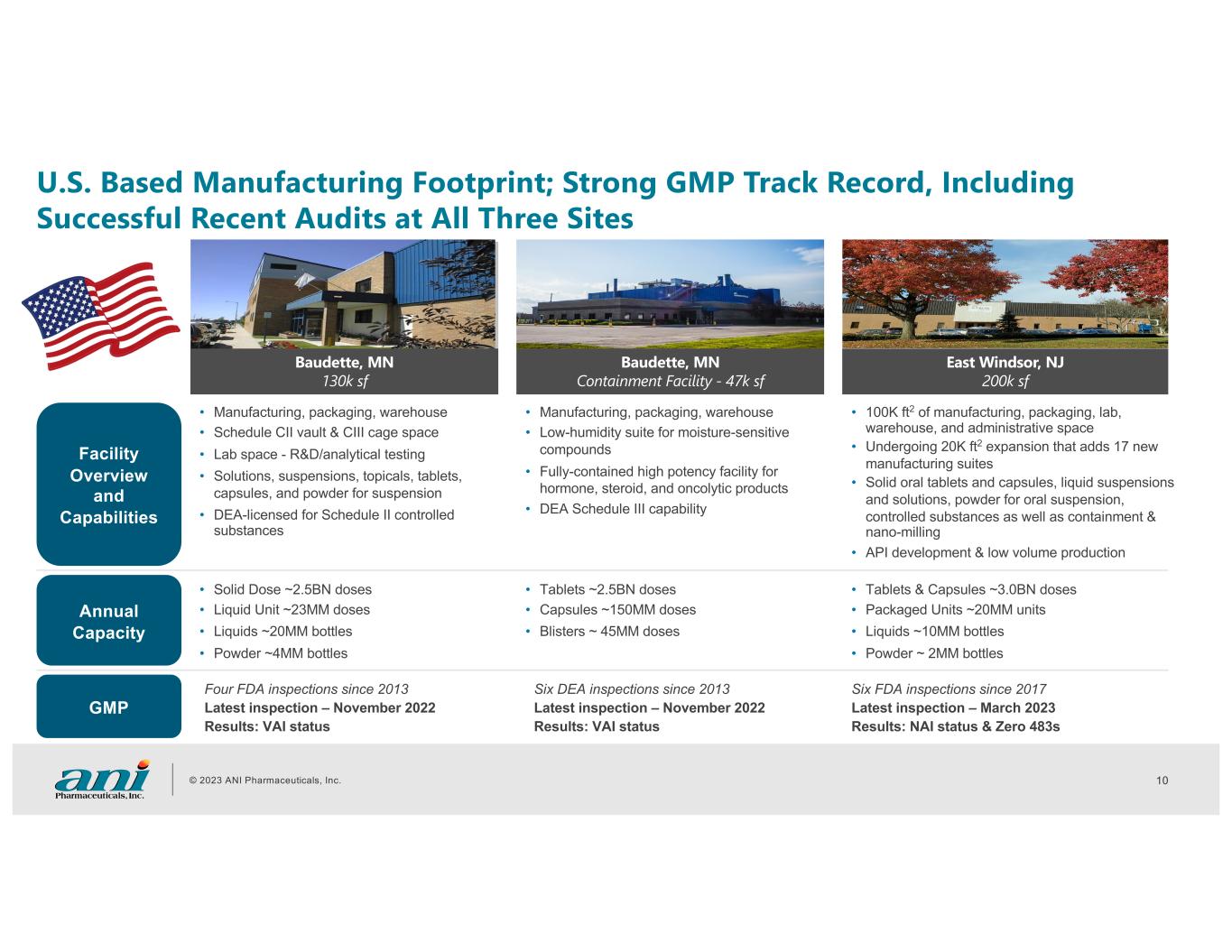 © 2023 ANI Pharmaceuticals, Inc. 9 Strong R&D Capabilities, Operational Excellence and U.S.-based Manufacturing Footprint Helped Capture New Business Opportunities and Drive Growth in Generics 1 Superior pipeline and new product launch execution • Increased R&D investment with focus on niche opportunities • Filed 5 new ANDAs in 2023, including ANI’s first two Para IV submissions • Retained top 12 ranking in number of ANDA approvals* • 2023 launches include Colestipol, Nitrofurantoin suspension & Estradiol Gel Driving cost- excellence • Significant focus on savings in procurement of raw materials and finished goods through innovative strategies • Lean and entrepreneurial mentality towards all spend • Augmented our analytical and development facility in Chennai, India with over 60 skilled colleagues Ensuring reliability of supply • Strong compliance and audit history enhanced further by successful recent FDA audits across sites • Maintaining healthy inventory levels for finished goods and raw materials • U.S.-based manufacturing sites (New Jersey & Minnesota) Generics Revenues ($ million) Q2’23 revenues of $63.3M demonstrated 27% growth over Q2’22 revenues of $49.9M 53.1 58.0 63.7 63.3 Q2’23Q1’23Q3’22 Q4’22 * Based on recent 6 months FDA approval activity; Source – FDA Website, Internal Analysis