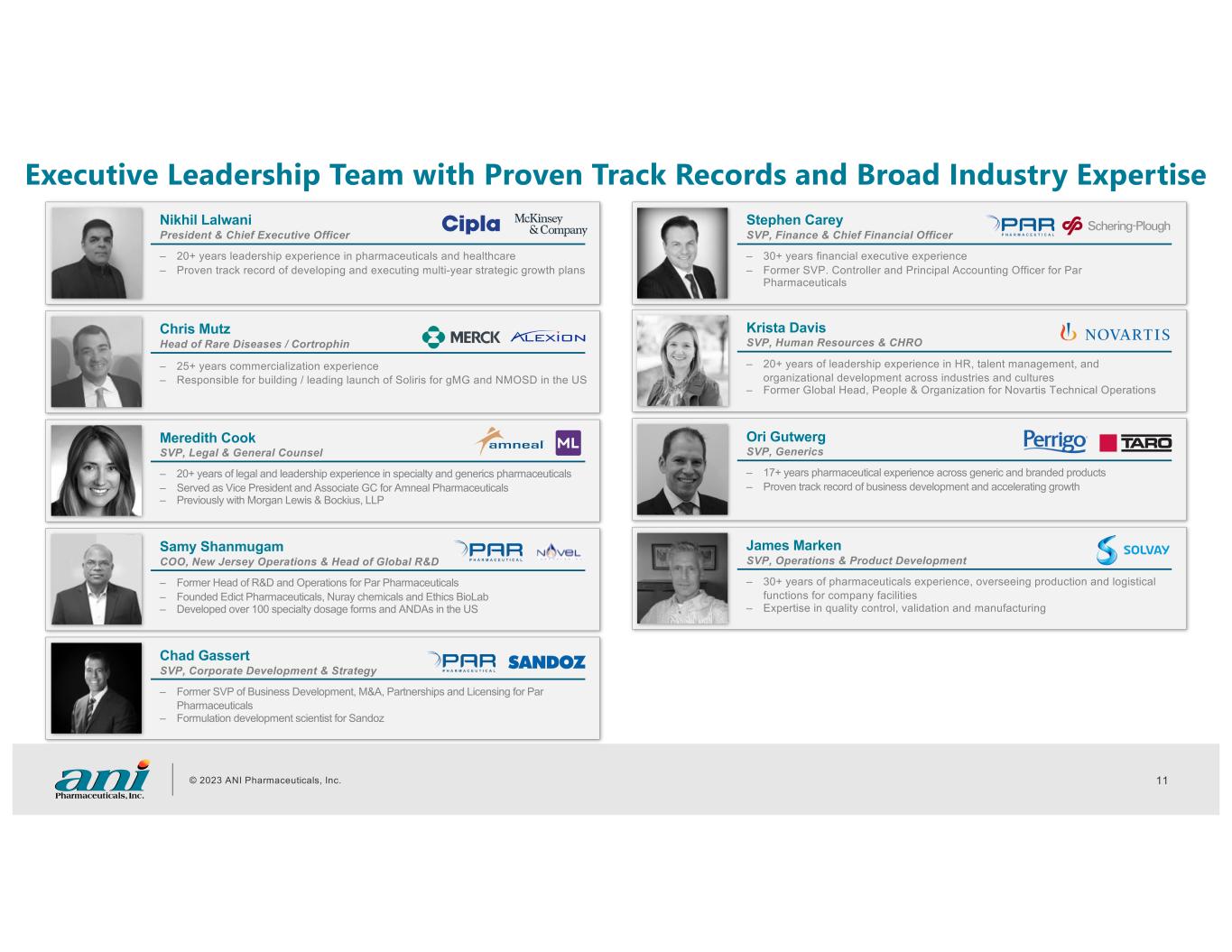 © 2023 ANI Pharmaceuticals, Inc. 10 U.S. Based Manufacturing Footprint; Strong GMP Track Record, Including Successful Recent Audits at All Three Sites • Manufacturing, packaging, warehouse • Schedule CII vault & CIII cage space • Lab space - R&D/analytical testing • Solutions, suspensions, topicals, tablets, capsules, and powder for suspension • DEA-licensed for Schedule II controlled substances • Solid Dose ~2.5BN doses • Liquid Unit ~23MM doses • Liquids ~20MM bottles • Powder ~4MM bottles Four FDA inspections since 2013 Latest inspection – November 2022 Results: VAI status Baudette, MN 130k sf • Manufacturing, packaging, warehouse • Low-humidity suite for moisture-sensitive compounds • Fully-contained high potency facility for hormone, steroid, and oncolytic products • DEA Schedule III capability • Tablets ~2.5BN doses • Capsules ~150MM doses • Blisters ~ 45MM doses Six DEA inspections since 2013 Latest inspection – November 2022 Results: VAI status Baudette, MN Containment Facility - 47k sf • 100K ft2 of manufacturing, packaging, lab, warehouse, and administrative space • Undergoing 20K ft2 expansion that adds 17 new manufacturing suites • Solid oral tablets and capsules, liquid suspensions and solutions, powder for oral suspension, controlled substances as well as containment & nano-milling • API development & low volume production • Tablets & Capsules ~3.0BN doses • Packaged Units ~20MM units • Liquids ~10MM bottles • Powder ~ 2MM bottles East Windsor, NJ 200k sf Six FDA inspections since 2017 Latest inspection – March 2023 Results: NAI status & Zero 483s Facility Overview and Capabilities GMP Annual Capacity