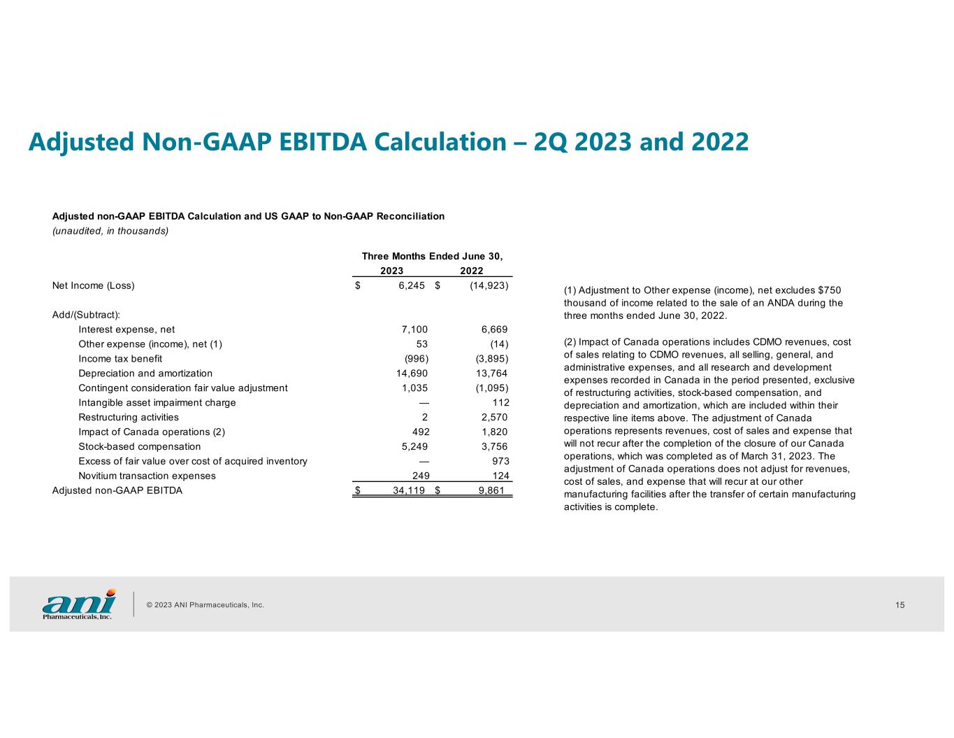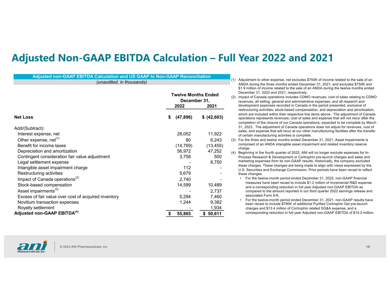 © 2023 ANI Pharmaceuticals, Inc. 15 Adjusted Non-GAAP EBITDA Calculation – 2Q 2023 and 2022 Adjusted non-GAAP EBITDA Calculation and US GAAP to Non-GAAP Reconciliation (unaudited, in thousands) 2023 2022 Net Income (Loss) $ 6,245 $ (14,923) Add/(Subtract): Interest expense, net 7,100 6,669 Other expense (income), net (1) 53 (14) Income tax benefit (996) (3,895) Depreciation and amortization 14,690 13,764 Contingent consideration fair value adjustment 1,035 (1,095) Intangible asset impairment charge — 112 Restructuring activities 2 2,570 Impact of Canada operations (2) 492 1,820 Stock-based compensation 5,249 3,756 Excess of fair value over cost of acquired inventory — 973 Novitium transaction expenses 249 124 Adjusted non-GAAP EBITDA $ 34,119 $ 9,861 Three Months Ended June 30, (1) Adjustment to Other expense (income), net excludes $750 thousand of income related to the sale of an ANDA during the three months ended June 30, 2022. (2) Impact of Canada operations includes CDMO revenues, cost of sales relating to CDMO revenues, all selling, general, and administrative expenses, and all research and development expenses recorded in Canada in the period presented, exclusive of restructuring activities, stock-based compensation, and depreciation and amortization, which are included within their respective line items above. The adjustment of Canada operations represents revenues, cost of sales and expense that will not recur after the completion of the closure of our Canada operations, which was completed as of March 31, 2023. The adjustment of Canada operations does not adjust for revenues, cost of sales, and expense that will recur at our other manufacturing facilities after the transfer of certain manufacturing activities is complete.