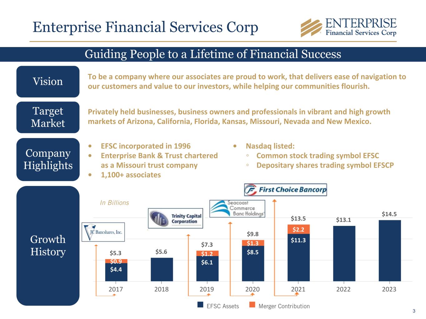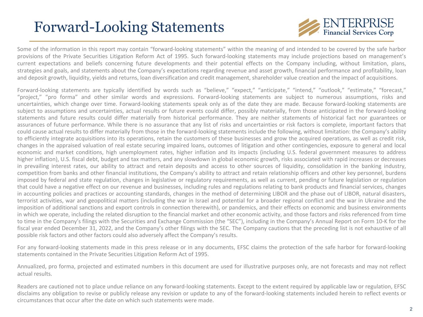 Forward-Looking Statements Some of the information in this report may contain “forward-looking statements” within the meaning of and intended to be covered by the safe harbor provisions of the Private Securities Litigation Reform Act of 1995. Such forward-looking statements may include projections based on management’s current expectations and beliefs concerning future developments and their potential effects on the Company including, without limitation, plans, strategies and goals, and statements about the Company’s expectations regarding revenue and asset growth, financial performance and profitability, loan and deposit growth, liquidity, yields and returns, loan diversification and credit management, shareholder value creation and the impact of acquisitions. Forward-looking statements are typically identified by words such as “believe,” “expect,” “anticipate,” “intend,” “outlook,” “estimate,” “forecast,” “project,” “pro forma” and other similar words and expressions. Forward-looking statements are subject to numerous assumptions, risks and uncertainties, which change over time. Forward-looking statements speak only as of the date they are made. Because forward-looking statements are subject to assumptions and uncertainties, actual results or future events could differ, possibly materially, from those anticipated in the forward-looking statements and future results could differ materially from historical performance. They are neither statements of historical fact nor guarantees or assurances of future performance. While there is no assurance that any list of risks and uncertainties or risk factors is complete, important factors that could cause actual results to differ materially from those in the forward-looking statements include the following, without limitation: the Company’s ability to efficiently integrate acquisitions into its operations, retain the customers of these businesses and grow the acquired operations, as well as credit risk, changes in the appraised valuation of real estate securing impaired loans, outcomes of litigation and other contingencies, exposure to general and local economic and market conditions, high unemployment rates, higher inflation and its impacts (including U.S. federal government measures to address higher inflation), U.S. fiscal debt, budget and tax matters, and any slowdown in global economic growth, risks associated with rapid increases or decreases in prevailing interest rates, our ability to attract and retain deposits and access to other sources of liquidity, consolidation in the banking industry, competition from banks and other financial institutions, the Company’s ability to attract and retain relationship officers and other key personnel, burdens imposed by federal and state regulation, changes in legislative or regulatory requirements, as well as current, pending or future legislation or regulation that could have a negative effect on our revenue and businesses, including rules and regulations relating to bank products and financial services, changes in accounting policies and practices or accounting standards, changes in the method of determining LIBOR and the phase out of LIBOR, natural disasters, terrorist activities, war and geopolitical matters (including the war in Israel and potential for a broader regional conflict and the war in Ukraine and the imposition of additional sanctions and export controls in connection therewith), or pandemics, and their effects on economic and business environments in which we operate, including the related disruption to the financial market and other economic activity, and those factors and risks referenced from time to time in the Company’s filings with the Securities and Exchange Commission (the “SEC”), including in the Company’s Annual Report on Form 10-K for the fiscal year ended December 31, 2022, and the Company’s other filings with the SEC. The Company cautions that the preceding list is not exhaustive of all possible risk factors and other factors could also adversely affect the Company’s results. For any forward-looking statements made in this press release or in any documents, EFSC claims the protection of the safe harbor for forward-looking statements contained in the Private Securities Litigation Reform Act of 1995. Annualized, pro forma, projected and estimated numbers in this document are used for illustrative purposes only, are not forecasts and may not reflect actual results. Readers are cautioned not to place undue reliance on any forward-looking statements. Except to the extent required by applicable law or regulation, EFSC disclaims any obligation to revise or publicly release any revision or update to any of the forward-looking statements included herein to reflect events or circumstances that occur after the date on which such statements were made. 2