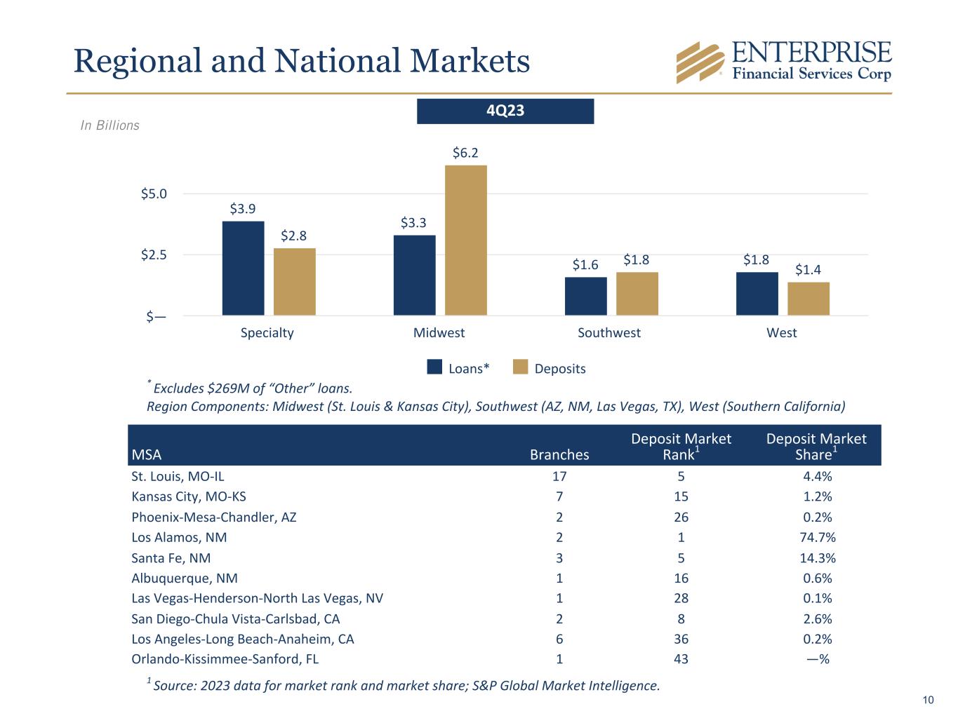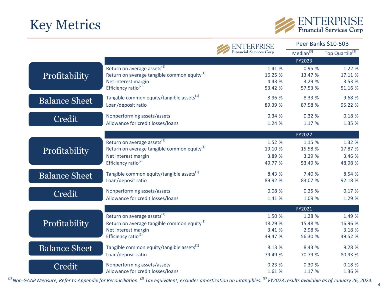Enterprise Financial Services Corp Guiding People to a Lifetime of Financial Success Company Highlights Vision To be a company where our associates are proud to work, that delivers ease of navigation to our customers and value to our investors, while helping our communities flourish. Target Market Privately held businesses, business owners and professionals in vibrant and high growth markets of Arizona, California, Florida, Kansas, Missouri, Nevada and New Mexico. • EFSC incorporated in 1996 • Enterprise Bank & Trust chartered as a Missouri trust company • 1,100+ associates • Nasdaq listed: ◦ Common stock trading symbol EFSC ◦ Depositary shares trading symbol EFSCP Growth History $5.3 $5.6 $7.3 $9.8 $13.5 $13.1 $14.5 $4.4 $6.1 $8.5 $11.3 $0.9 $1.2 $1.3 $2.2 EFSC Assets Merger Contribution 2017 2018 2019 2020 2021 2022 2023 In Billions 3