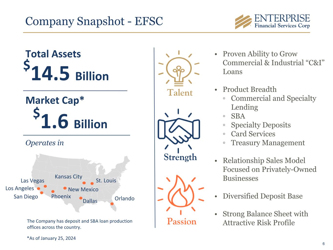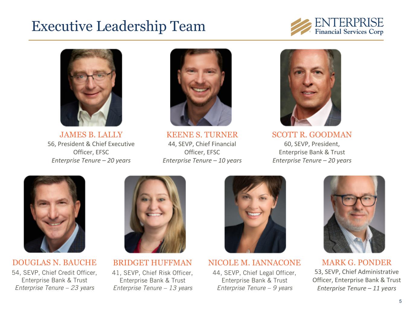 Executive Leadership Team JAMES B. LALLY 56, President & Chief Executive Officer, EFSC Enterprise Tenure – 20 years KEENE S. TURNER 44, SEVP, Chief Financial Officer, EFSC Enterprise Tenure – 10 years SCOTT R. GOODMAN 60, SEVP, President, Enterprise Bank & Trust Enterprise Tenure – 20 years DOUGLAS N. BAUCHE 54, SEVP, Chief Credit Officer, Enterprise Bank & Trust Enterprise Tenure – 23 years MARK G. PONDER 53, SEVP, Chief Administrative Officer, Enterprise Bank & Trust Enterprise Tenure – 11 years NICOLE M. IANNACONE 44, SEVP, Chief Legal Officer, Enterprise Bank & Trust Enterprise Tenure – 9 years BRIDGET HUFFMAN 41, SEVP, Chief Risk Officer, Enterprise Bank & Trust Enterprise Tenure – 13 years 5