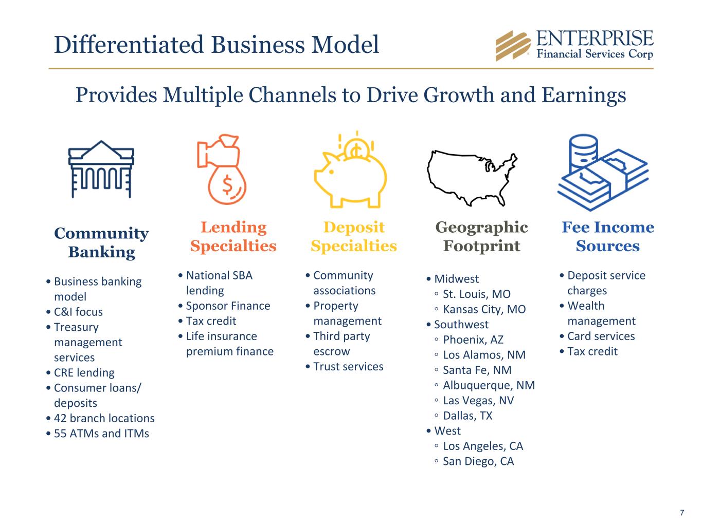 Company Snapshot - EFSC Total Assets $14.5 Billion Market Cap* Operates in St. Louis Kansas City Phoenix $1.6 Billion • Proven Ability to Grow Commercial & Industrial “C&I” Loans • Product Breadth ◦ Commercial and Specialty Lending ◦ SBA ◦ Specialty Deposits ◦ Card Services ◦ Treasury Management • Relationship Sales Model Focused on Privately-Owned Businesses • Diversified Deposit Base • Strong Balance Sheet with Attractive Risk Profile Talent Strength Passion New MexicoLos Angeles Las Vegas The Company has deposit and SBA loan production offices across the country. San Diego Dallas *As of January 25, 2024 Orlando 6