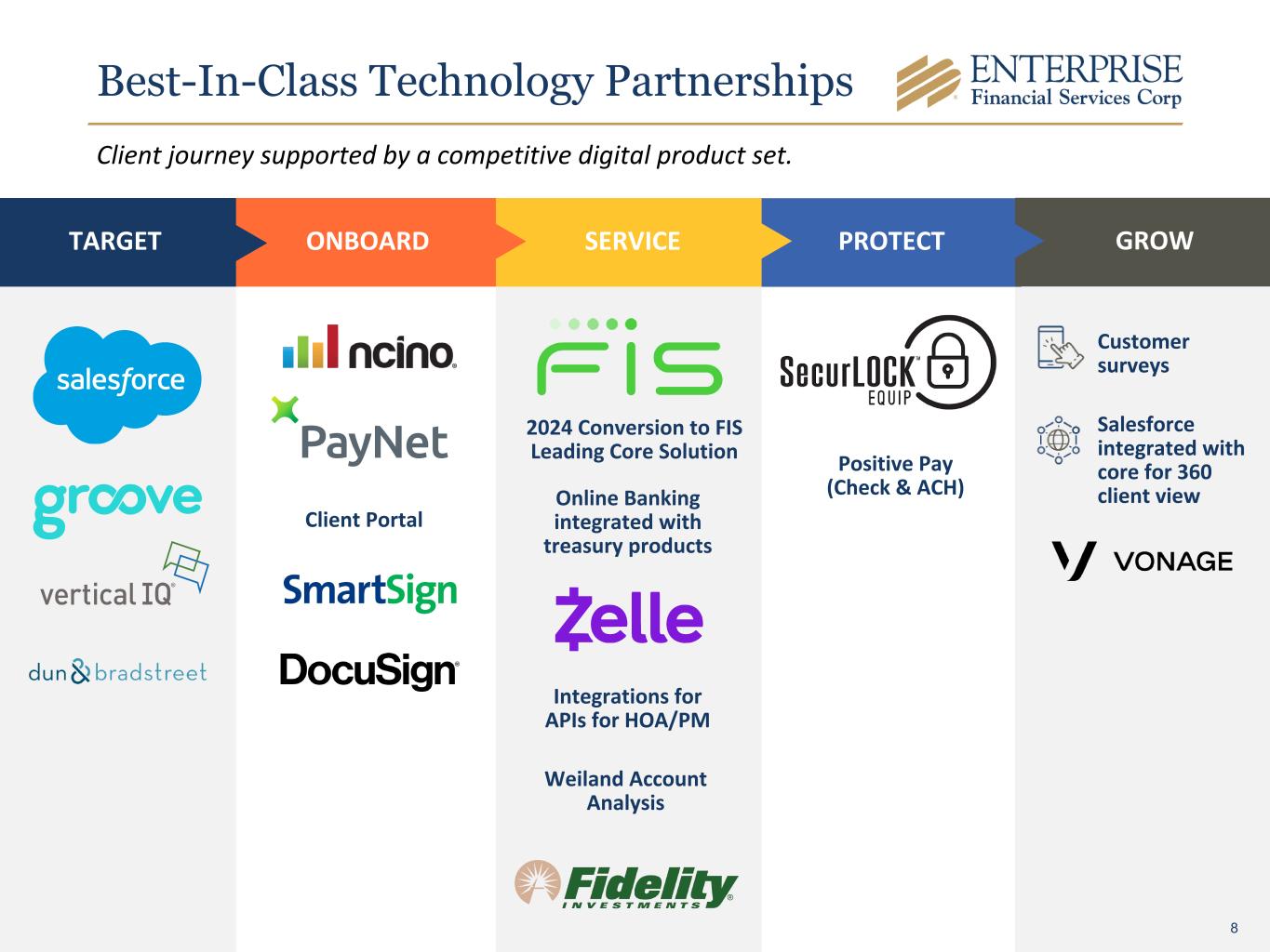 Differentiated Business Model Focused and Well-Defined Strategy Aimed at Business Owners, Executives and Professionals. Community Banking • Business banking model • C&I focus • Treasury management services • CRE lending • Consumer loans/ deposits • 42 branch locations • 55 ATMs and ITMs Lending Specialties • National SBA lending • Sponsor Finance • Tax credit • Life insurance premium finance Deposit Specialties • Community associations • Property management • Third party escrow • Trust services Geographic Footprint •Midwest ◦ St. Louis, MO ◦ Kansas City, MO • Southwest ◦ Phoenix, AZ ◦ Los Alamos, NM ◦ Santa Fe, NM ◦ Albuquerque, NM ◦ Las Vegas, NV ◦ Dallas, TX •West ◦ Los Angeles, CA ◦ San Diego, CA Fee Income Sources • Deposit service charges •Wealth management • Card services • Tax credit Provides Multiple Channels to Drive Growth and Earnings 7