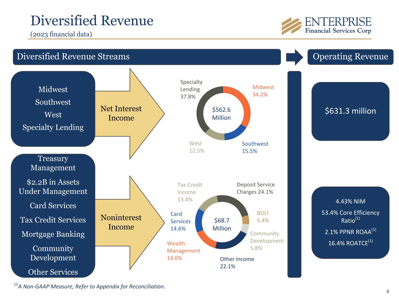 Treasury Management $2.2B in Assets Under Management Card Services Tax Credit Services Mortgage Banking Community Development Other Services Midwest Southwest West Specialty Lending Net Interest Income Noninterest Income Midwest 34.2% Southwest 15.5% West 12.5% Specialty Lending 37.8% $562.6 Million Wealth Management 14.6% Card Services 14.6% Tax Credit Income 13.4% Deposit Service Charges 24.1% BOLI 5.4% Community Development 5.8% Other income 22.1% $631.3 million 4.43% NIM 53.4% Core Efficiency Ratio(1) 2.1% PPNR ROAA(1) 16.4% ROATCE(1) Diversified Revenue Streams $68.7 Million Operating Revenue (1)A Non-GAAP Measure, Refer to Appendix for Reconciliation. Diversified Revenue (2023 financial data) 9