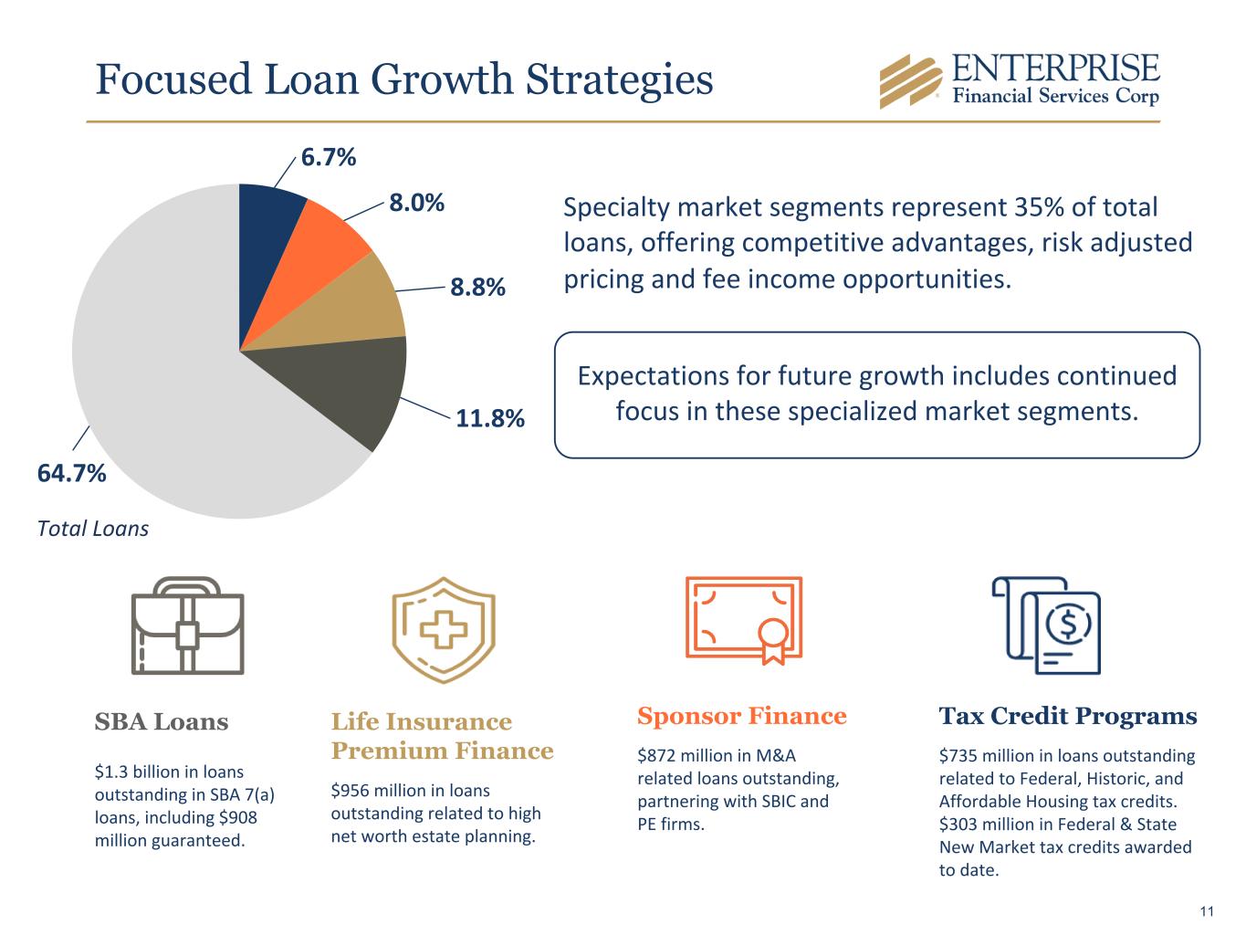 Regional and National Markets 1 Source: 2023 data for market rank and market share; S&P Global Market Intelligence. $3.9 $3.3 $1.6 $1.8 $2.8 $6.2 $1.8 $1.4 Loans* Deposits Specialty Midwest Southwest West $— $2.5 $5.0 MSA Branches Deposit Market Rank1 Deposit Market Share1 St. Louis, MO-IL 17 5 4.4% Kansas City, MO-KS 7 15 1.2% Phoenix-Mesa-Chandler, AZ 2 26 0.2% Los Alamos, NM 2 1 74.7% Santa Fe, NM 3 5 14.3% Albuquerque, NM 1 16 0.6% Las Vegas-Henderson-North Las Vegas, NV 1 28 0.1% San Diego-Chula Vista-Carlsbad, CA 2 8 2.6% Los Angeles-Long Beach-Anaheim, CA 6 36 0.2% Orlando-Kissimmee-Sanford, FL 1 43 —% In Billions * Excludes $269M of “Other” loans. 4Q23 Region Components: Midwest (St. Louis & Kansas City), Southwest (AZ, NM, Las Vegas, TX), West (Southern California) 10
