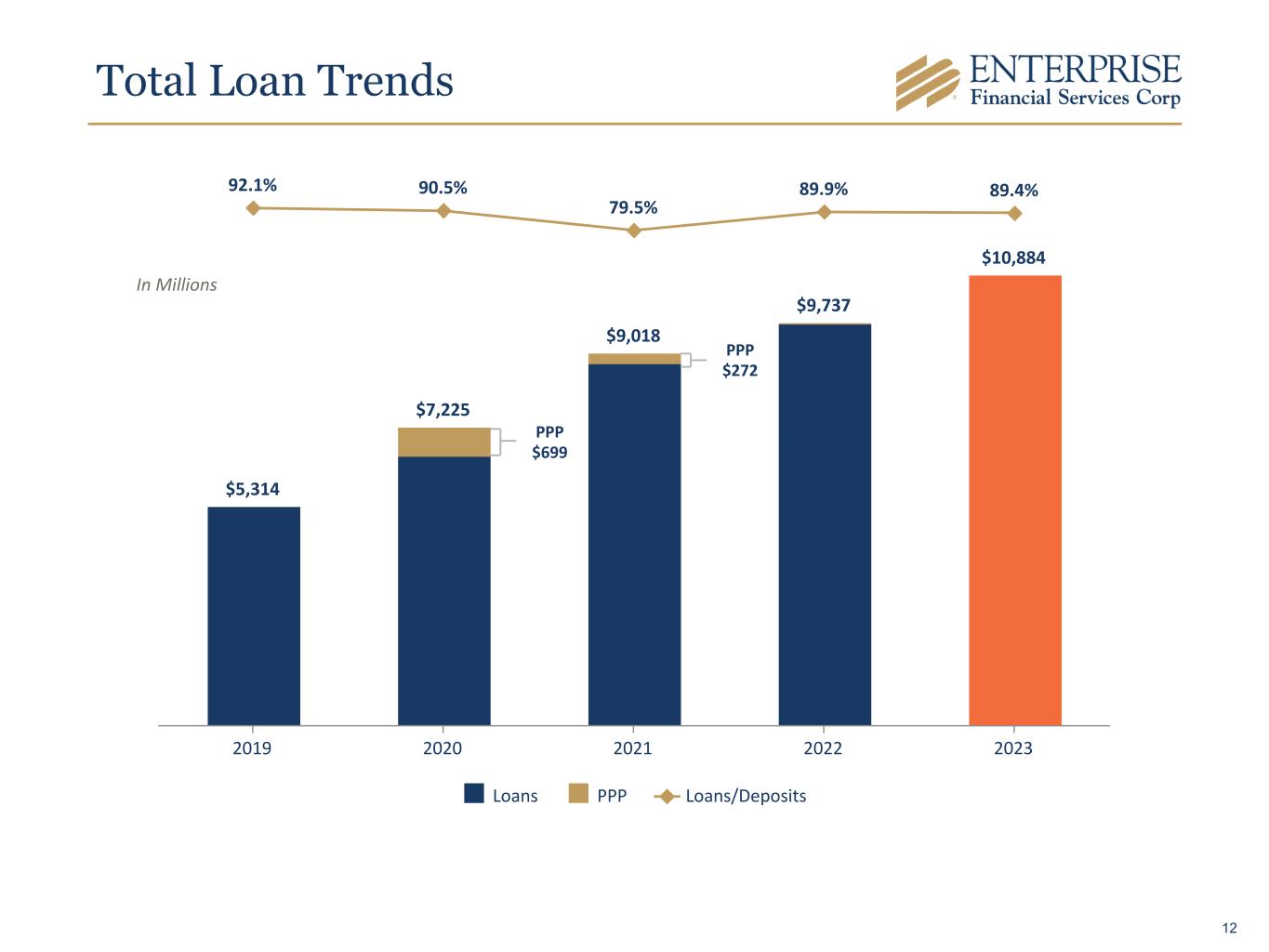 Total Loan Trends $5,314 $7,225 $9,018 $9,737 $10,884 92.1% 90.5% 79.5% 89.9% 89.4% Loans PPP Loans/Deposits 2019 2020 2021 2022 2023 In Millions PPP $272 PPP $699 PPP $699 12
